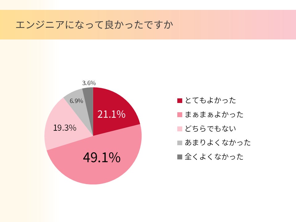エンジニアになってよかったと思うかたずねたところ、「とてもよかった」「まぁまぁよかった」と答えた方が70.2%でした。