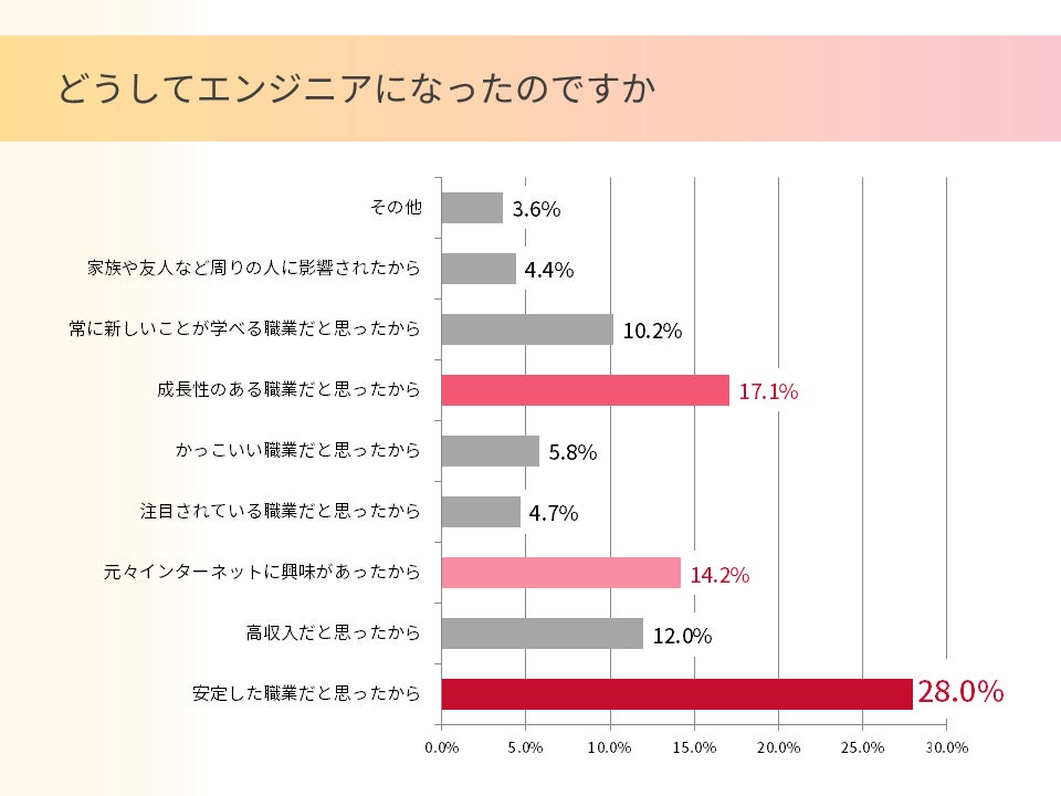 エンジニアになった理由をたずねると、最も多かったのは「安定した職業だと思ったから」で28%、次に「成長性のある職業だと思ったから」で17.1%、「元々インターネットに興味があったから」が14.2%でした。