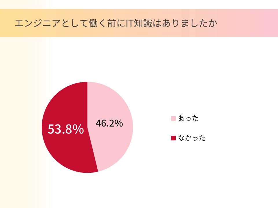エンジニアとして働く前にITの知識があったかどうかたずねたところ、半数以上の53.8%がなかった、と回答しました。