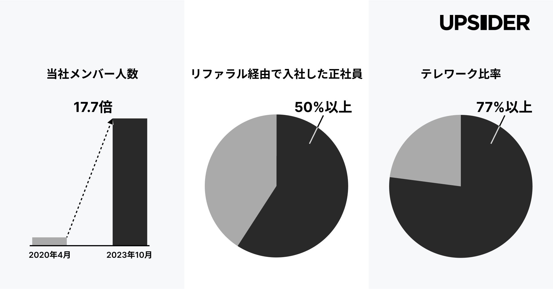 ・UPSIDERをリリースした年である2020年の4月〜2023年10月にかけて、当社メンバーの人数は、17.7倍に成長しました。組織として大きく成長した一方、事業規模の成長と比較すると、まだまだ少数精鋭の体制を保っている状態です。