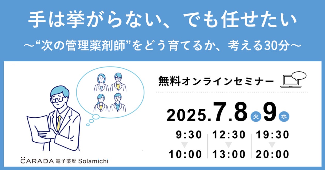 クラウド電子薬歴『CARADA 電子薬歴 Solamichi』の企画・開発・販売を行う株式会社ソラミチシステムは、無料オンラインセミナー「手は挙がらない、でも任せたい。〜“次の管理薬剤師”をどう育てるか、考える30分〜 」を7月8日(火)、9日(水)に開催します。