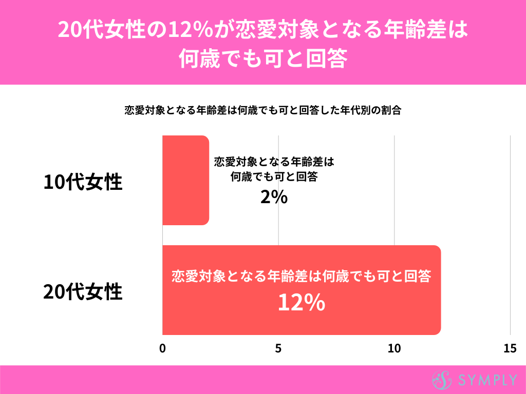 恋愛対象となる年齢差は何歳でも可と回答した割合を年代別で見てみますと、20代女性は12%だったのに対し、10代女性は2%にとどまりました。