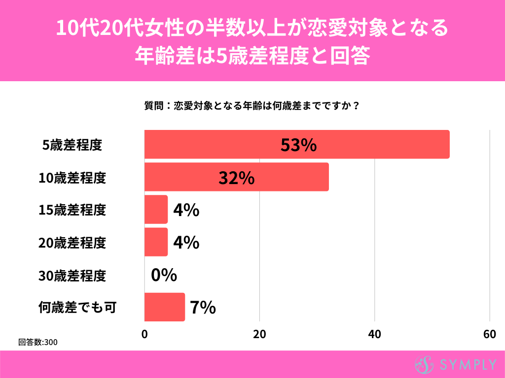 10代〜20代の女性を対象とした「恋愛対象となる年齢は何歳差までですか?」というアンケートで最も多かった回答は「5歳差程度」で53%でした。