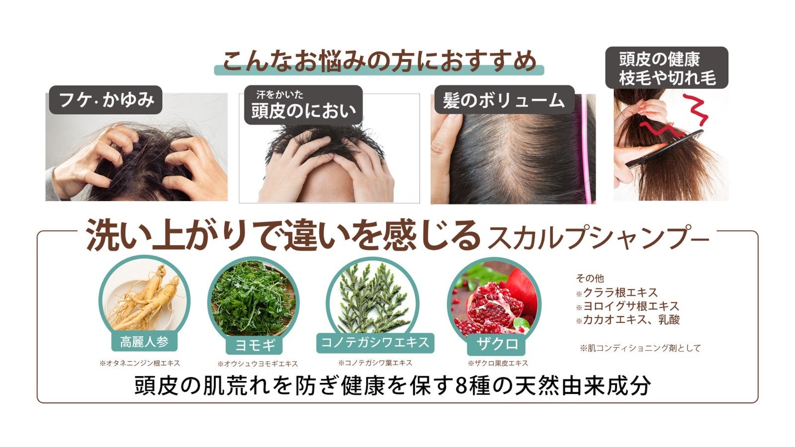 高麗人参、コノテガシワ葉エキス、ザクロ果皮エキス、オウシュウヨモギエキス、クララ根エキス、カカオエキス、ヨロイグサ根エキス、乳酸の8種の自然由来成分を配合し、フケやかゆみを抑えて頭皮の健康を保ちます。