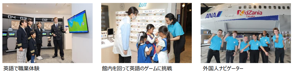左から:英語で職業体験/館内を回って英語のゲームに挑戦/外国人ナビゲーター