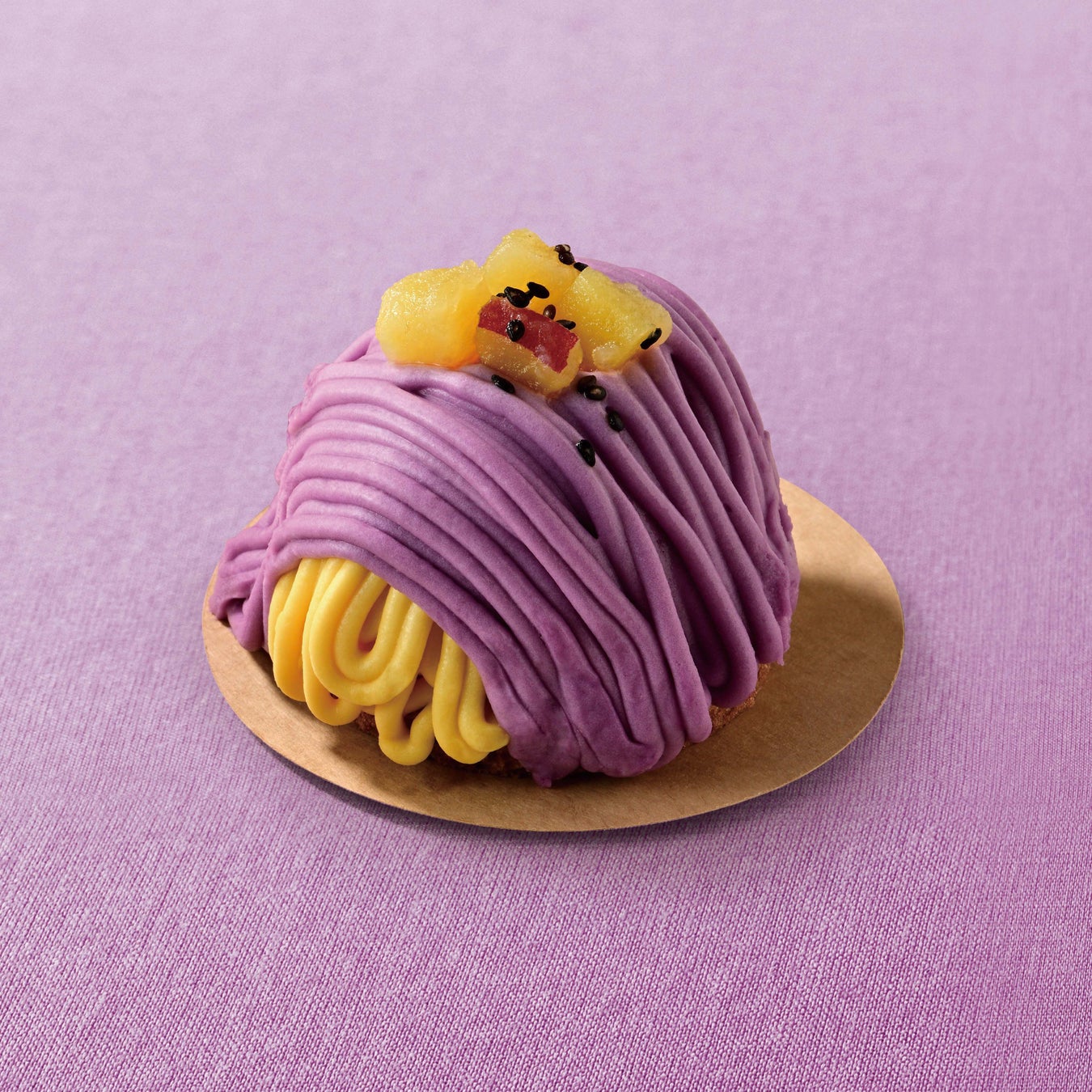 紫芋と紅はるか芋を使用した2色使いが目を引くモンブラン。