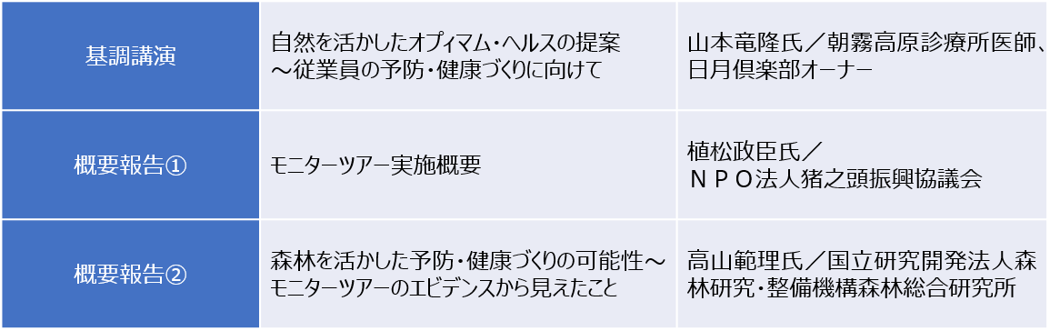 令和3年度林野庁補助事業「森林サービス産業」モデル地域等(健康経営分野)創出支援事業を活用し、令和3年12月4日、5日に実施したモニターツアーの様子を御報告するとともに、ツアーが心身にどのような影響を与えたかなどについて、御紹介します。
