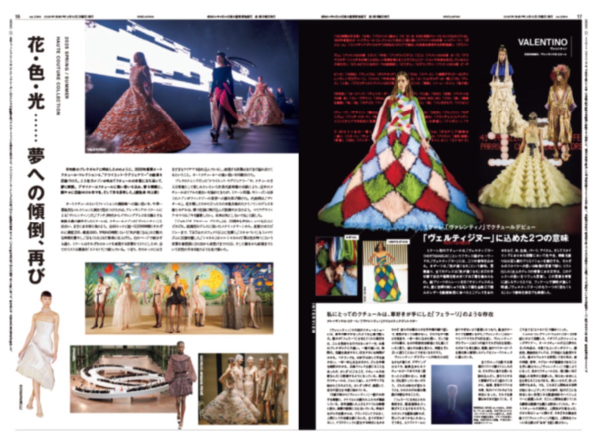 第二特集では、このほどフランス・パリで開催されたオートクチュール・コレクションを6ページに渡ってレポートします。強烈なコレクションで改めて装飾主義の世界観を強く打ち出したアレッサンドロ・ミケーレ(Alessandro Michele)による「ヴァレンティノ(VALENTINO)」をはじめ、花や色彩、光などの要素を使って美しくきらびやかなドレスを発表した各ブランドを6ページにわたって贅沢に紹介します。