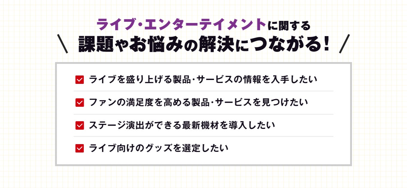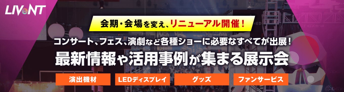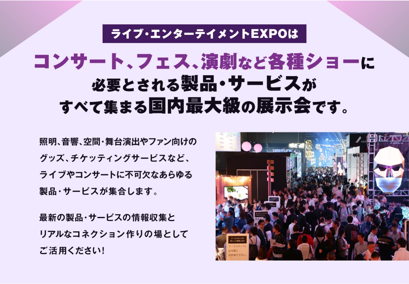 同展示会には、演出機材やグッズ、チケッティングサービスなど、ライブやフェス、演劇などに関わる企業や製品が多数出展。プロモーターや音楽事務所、ライブイベント事業関係者などが多数来場します。