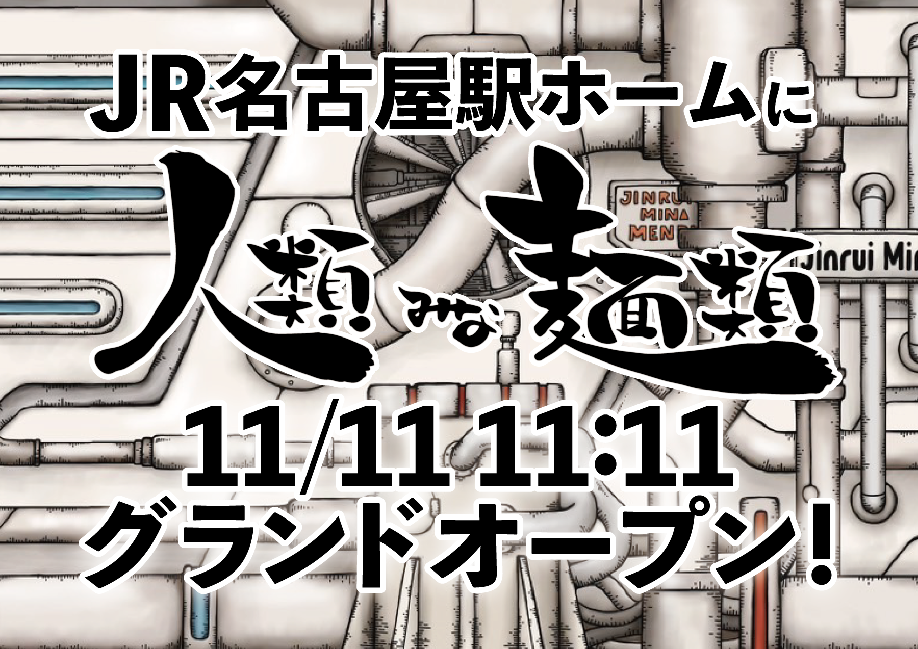 ⼤阪⾏列No.1ラーメン店「⼈類みな麺類(⼤阪・南⽅)」を運営するUNCHI株式会社(本社:⼤阪市淀川区、代表取締役:松村貴⼤)は、名古屋ステーション開発株式会社(名古屋市中村区、代表取締役社長:河野 俊輔)が、中央新幹線の工事に伴い使用が停止されているJR名古屋駅1番線の線路上スペースを利用した企画の第2弾として、11月11日(土)に「人類みな麺類 JR名古屋駅・幻の1番線」を出店いたします。