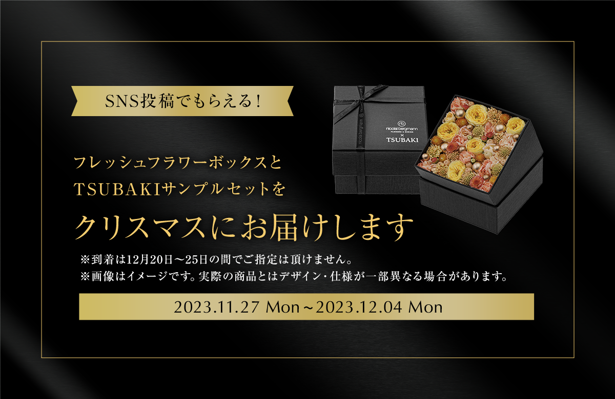 街中が華やぎだすホリデーシーズンに、ふと1年を振り返ってみると、きっと皆さんの中に、あの時伝えらえなかった「ありがとう」や「ごめんね」、そしてあなた自身への「頑張ったね」など様々な想いが交差しているのではないでしょうか。TSUBAKIはそんな想いに花という彩りを添えるクリスマスキャンペーンをご用意しました。ホリデーシーズンならではの華やかさと共に贈るのは、ニコライ・バーグマンの代名詞でもあるフラワーボックス。【想いを届けるあなたの、そして受け取り手の誰かの1日が心まで艶めくような1日になりますように】、TSUBAKIとニコライ バーグマンのそんな想いが込められたホリデーシーズンを彩る特別なキャンペーンです。