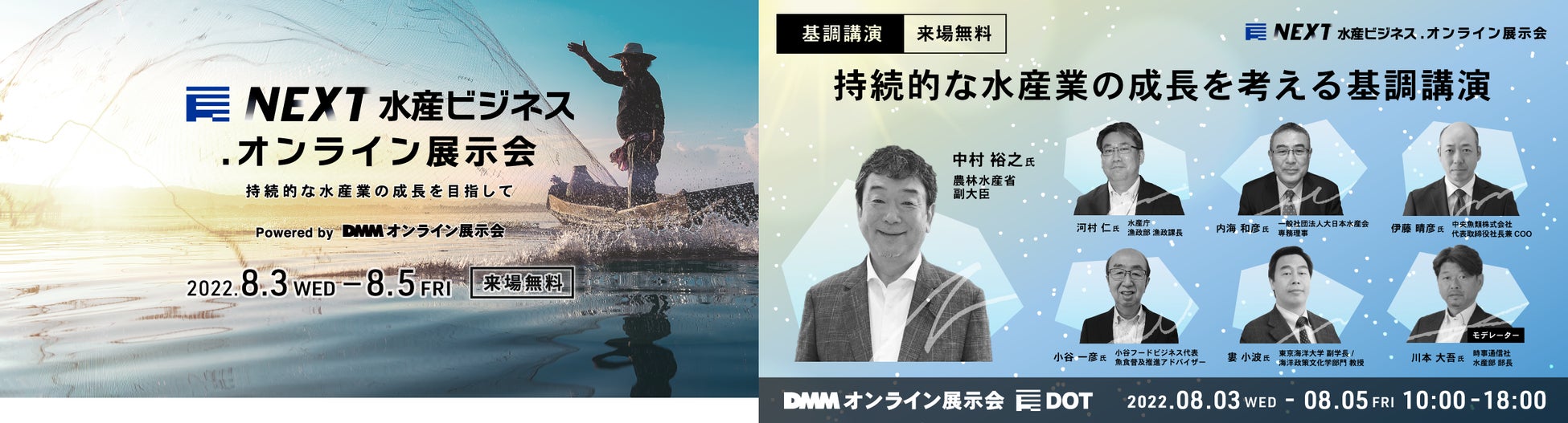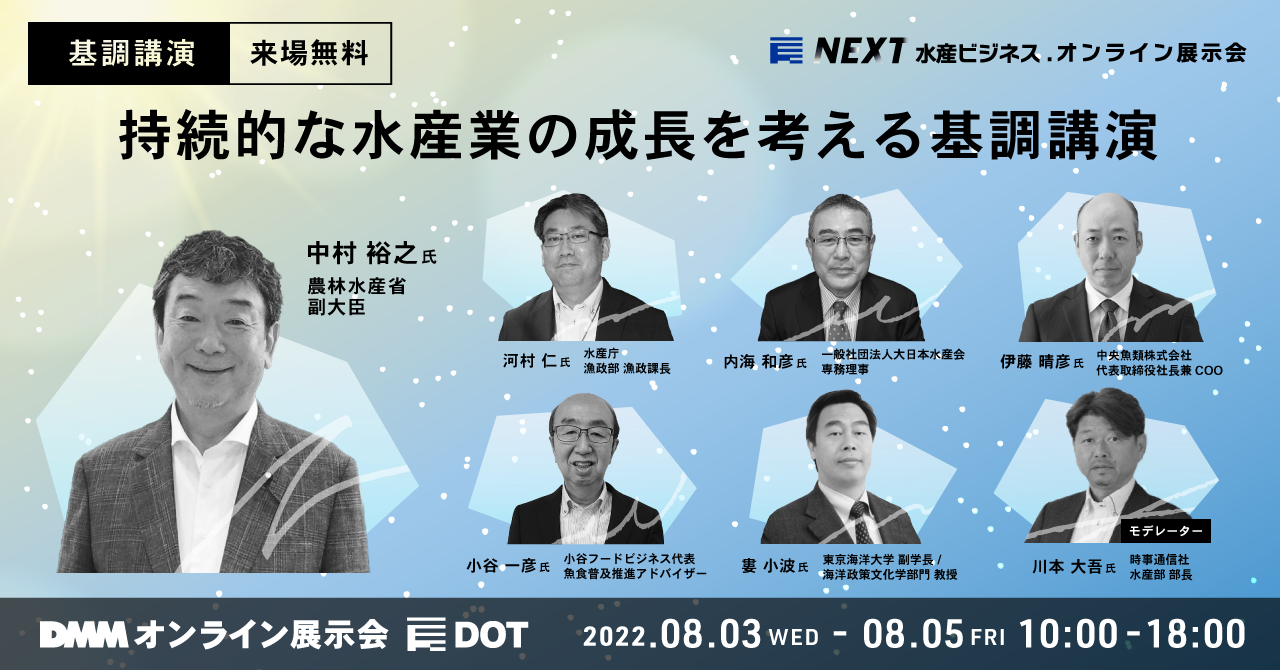 また、本展示会は、基調講演にて農林水産省 副大臣 中村裕之氏や水産庁 漁政部 漁政課長 河村仁 氏、東京海洋大学 副学長/海洋政策文化学部門 教授 婁小波 氏にご登壇いただき、産学官を巻き込んだ形で開催したオンライン展示会となりました。