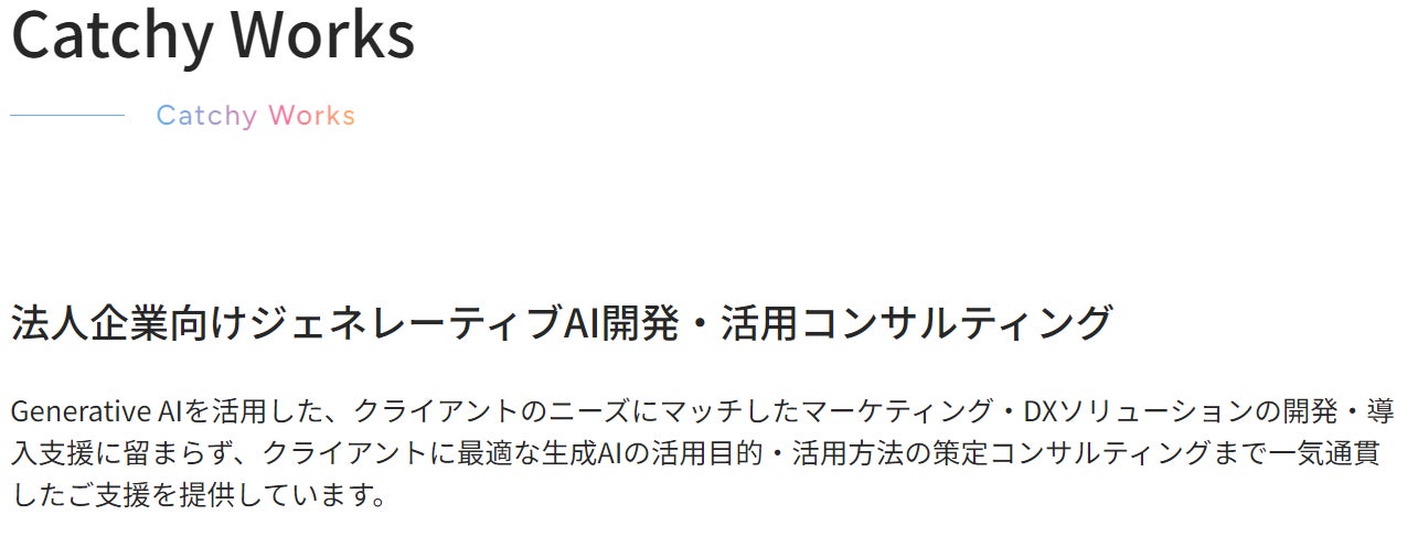 Catchy worksは、GPTシリーズを活用した国内最大級のAIコピーライティングツール「Catchy(キャッチー)」(会員数6万人)を運営する株式会社デジタルレシピが、GPTシリーズの導入支援を行うために開発したサービスです。企業がGPT-4をはじめとする最新のAI技術を利用することをサポートし、革新的な顧客体験の創出を目指しています。