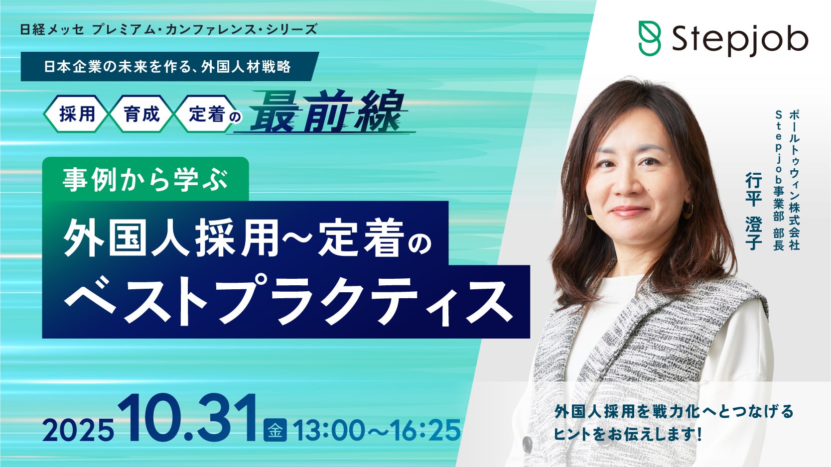 本カンファレンスでは、「Stepjob」の部長である行平澄子が、「事例から学ぶ外国人採用〜定着のベストプラクティス」をテーマに講演。現場で直面しやすい課題とその解決策に加え、「Stepjob」が提供する定着・手続き支援の具体的な仕組みをご紹介いたします。