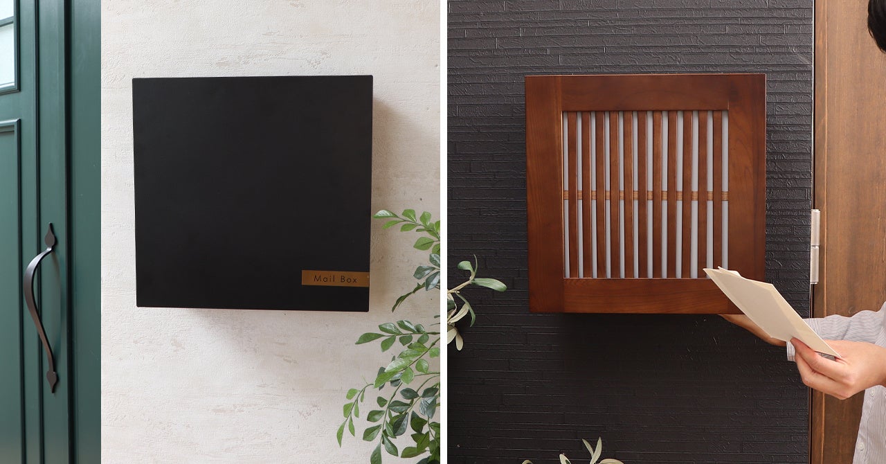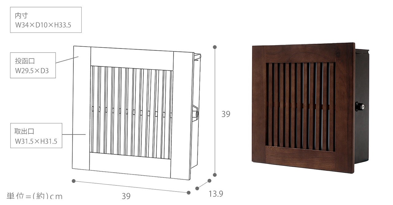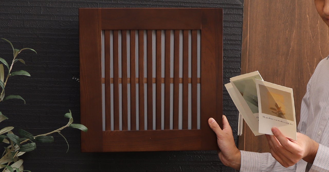 天然木の縦格子が和の雰囲気を醸し出す壁掛けポスト。正面からボックスは見えないのでスタイリッシュな印象です。大きな取出し口で使い勝手が良く、鍵付きで防犯面も安心です。