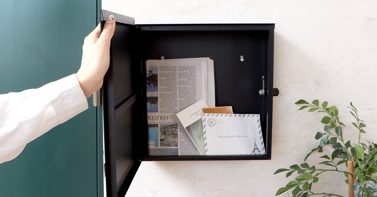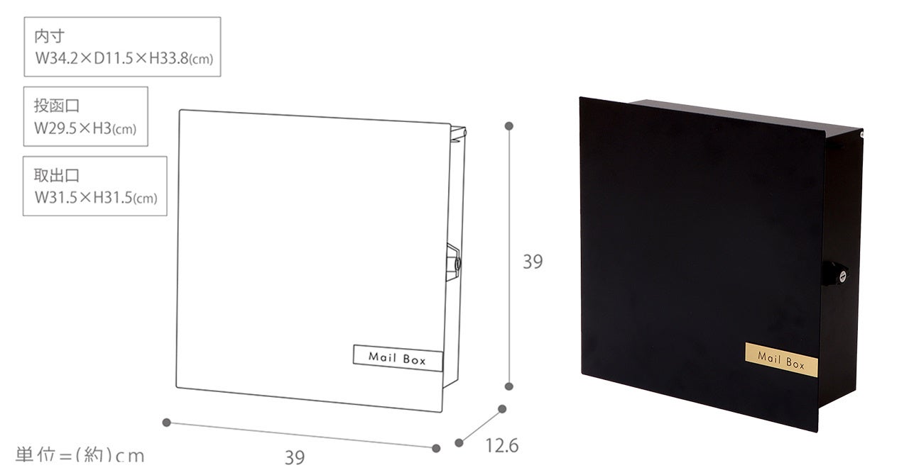 投函口は29.5x3cmと広く、A4サイズ・厚み3cm以内のメール便・カタログ・レターパックなどにも対応します。また、フタが付いているので、雨の侵入を防いでくれます。取り出し口は、31.5x31.5と大きく開くよう設計されているので、中の確認や取り出しが楽です。