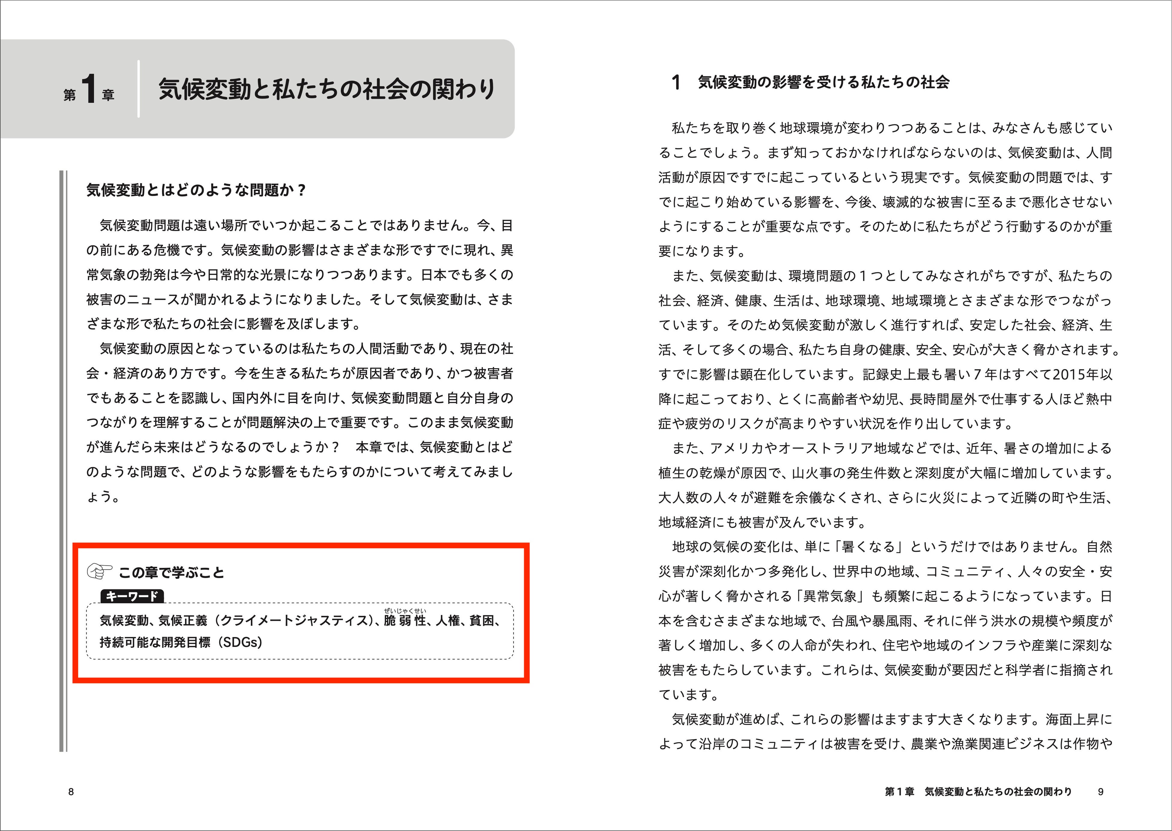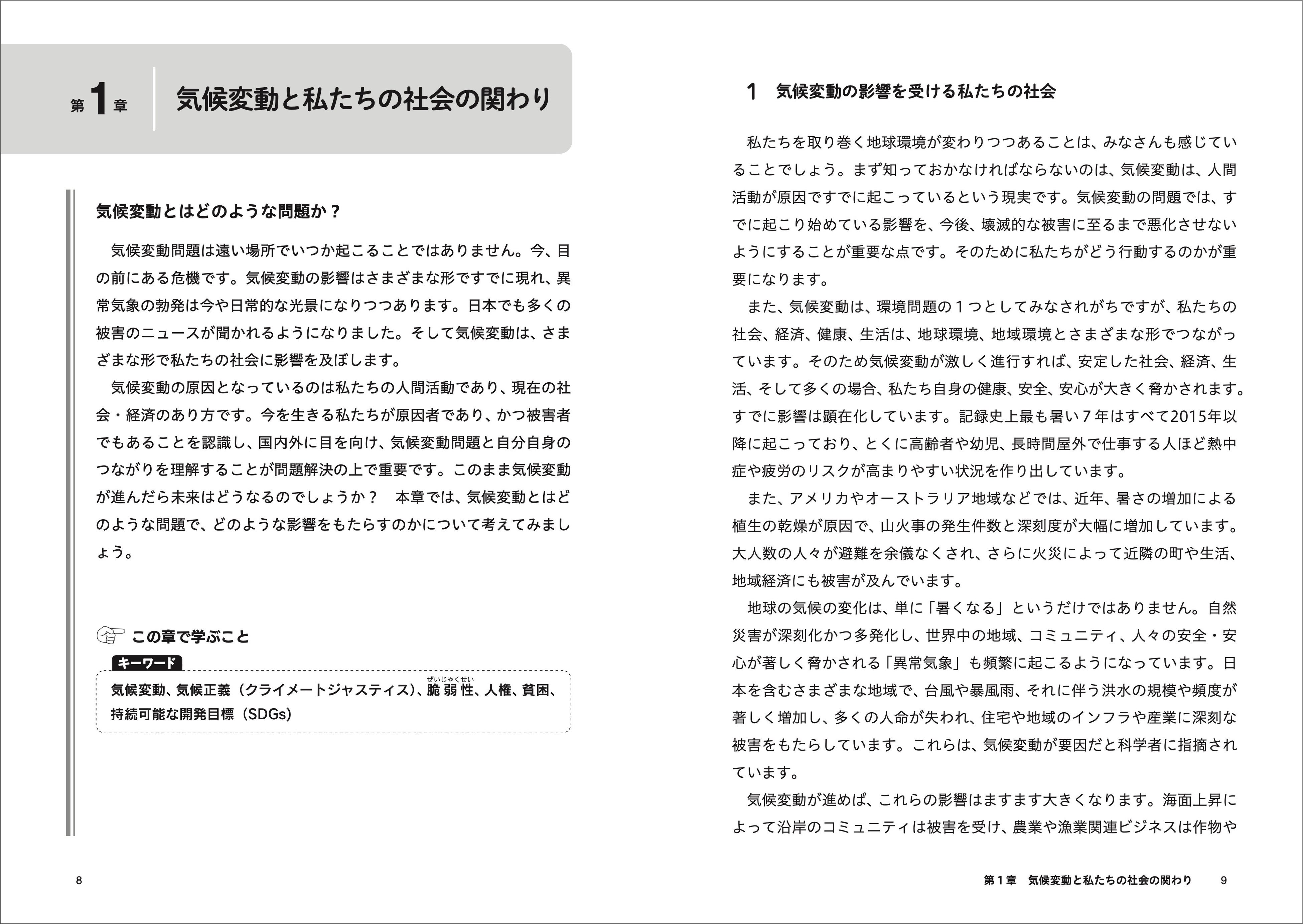 各章の冒頭に、その章の学びのねらいやキーワードがまとめられています。教師、企業・行政の気候変動対策の担当、企画部の担当など、気候変動を学ぶすべての人のための参考になるテキスト。