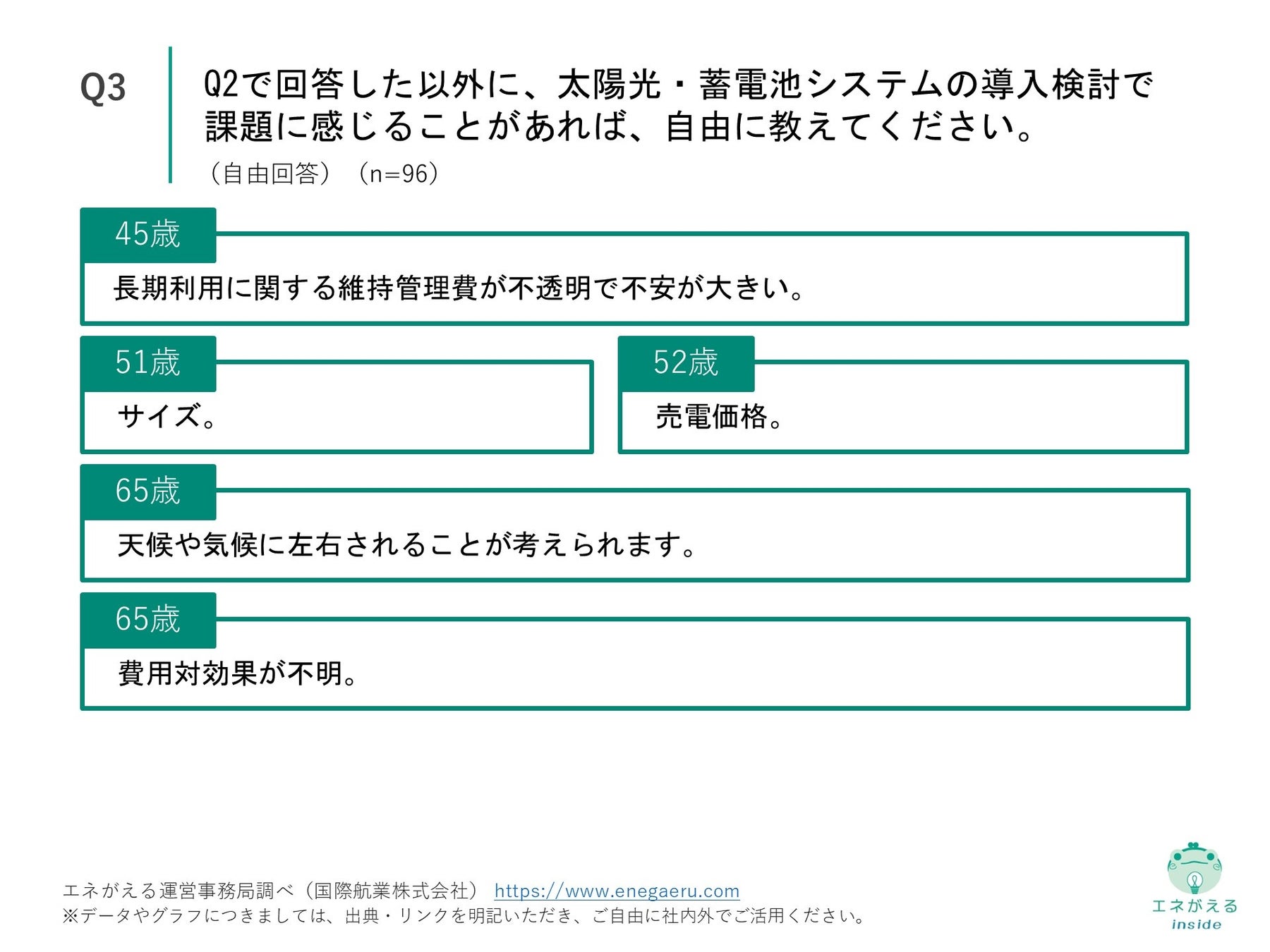 Q2で「わからない/答えられない」以外を回答した方に、「Q3.Q2で回答した以外に、太陽光・蓄電池システムの導入検討で課題に感じることがあれば、自由に教えてください。(自由回答)」(n=96)と質問したところ、「長期利用に関する維持管理費が不透明で不安が大きい」や「売電価格」など、40の回答を得ることができました。