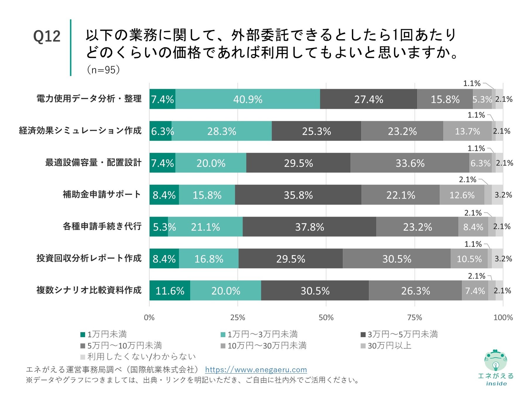 Q11で「非常にそう思う」「ややそう思う」と回答した方に、「Q12.以下の業務に関して、外部委託できるとしたら1回あたりどのくらいの価格であれば利用してもよいと思いますか。」(n=95)と質問したところ、電力使用データ分析・整理は、「1万円〜3万円未満」で40.9%、各種申請手続き代行は、「3万円〜5万円未満」で37.8%などという回答になりました。
