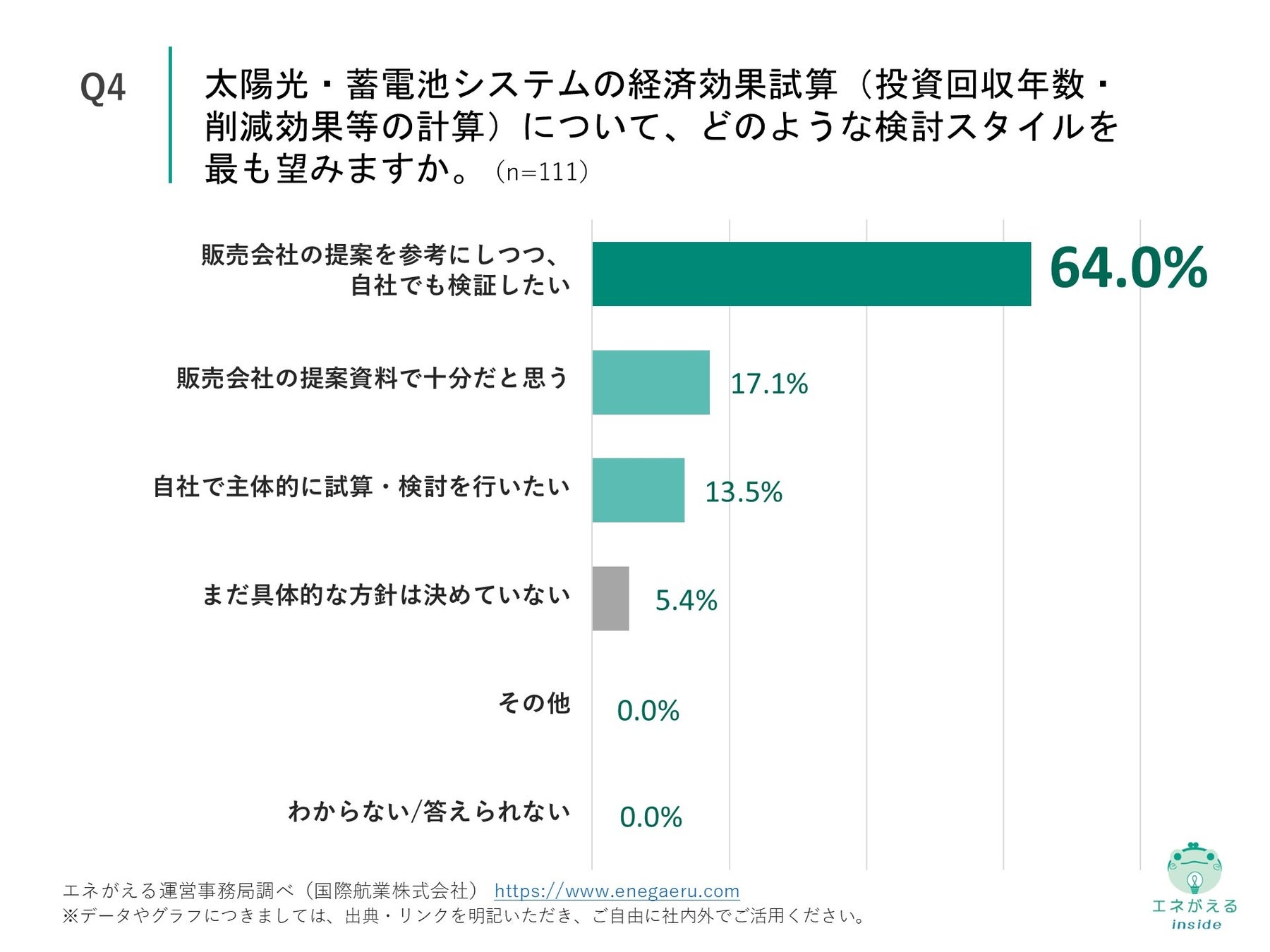 「Q4.太陽光・蓄電池システムの経済効果試算(投資回収年数・削減効果等の計算)について、どのような検討スタイルを最も望みますか。」(n=111)と質問したところ、「販売会社の提案を参考にしつつ、自社でも検証したい」が64.0%、「販売会社の提案資料で十分だと思う」が17.1%という回答になりました。