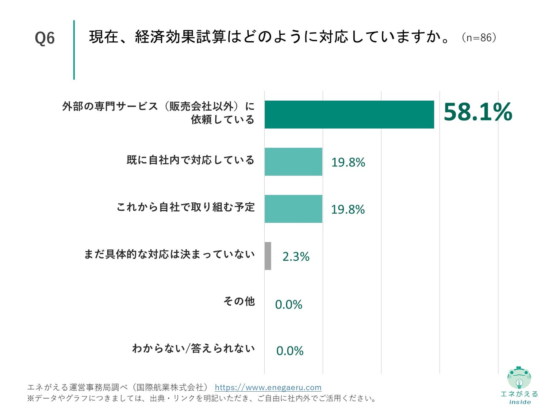 Q4で「自社で主体的に試算・検討を行いたい」「販売会社の提案を参考にしつつ、自社でも検証したい」と回答した方に、「Q6.現在、経済効果試算はどのように対応していますか。」(n=86)と質問したところ、「外部の専門サービス(販売会社以外)に依頼している」が58.1%、「既に自社内で対応している」が19.8%、「これから自社で取り組む予定」が19.8%という回答になりました。
