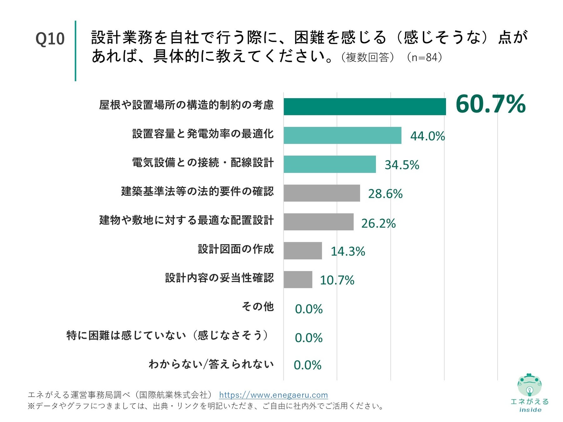 Q9で「自社で主体的に設計・検討を行いたい」「販売会社の提案を参考にしつつ、自社でも検証したい」と回答した方に、「Q10.設計業務を自社で行う際に、困難を感じる(感じそうな)点があれば、具体的に教えてください。(複数回答)」(n=84)と質問したところ、「屋根や設置場所の構造的制約の考慮」が60.7%、「設置容量と発電効率の最適化」が44.0%、「電気設備との接続・配線設計」が34.5%という回答になりました。