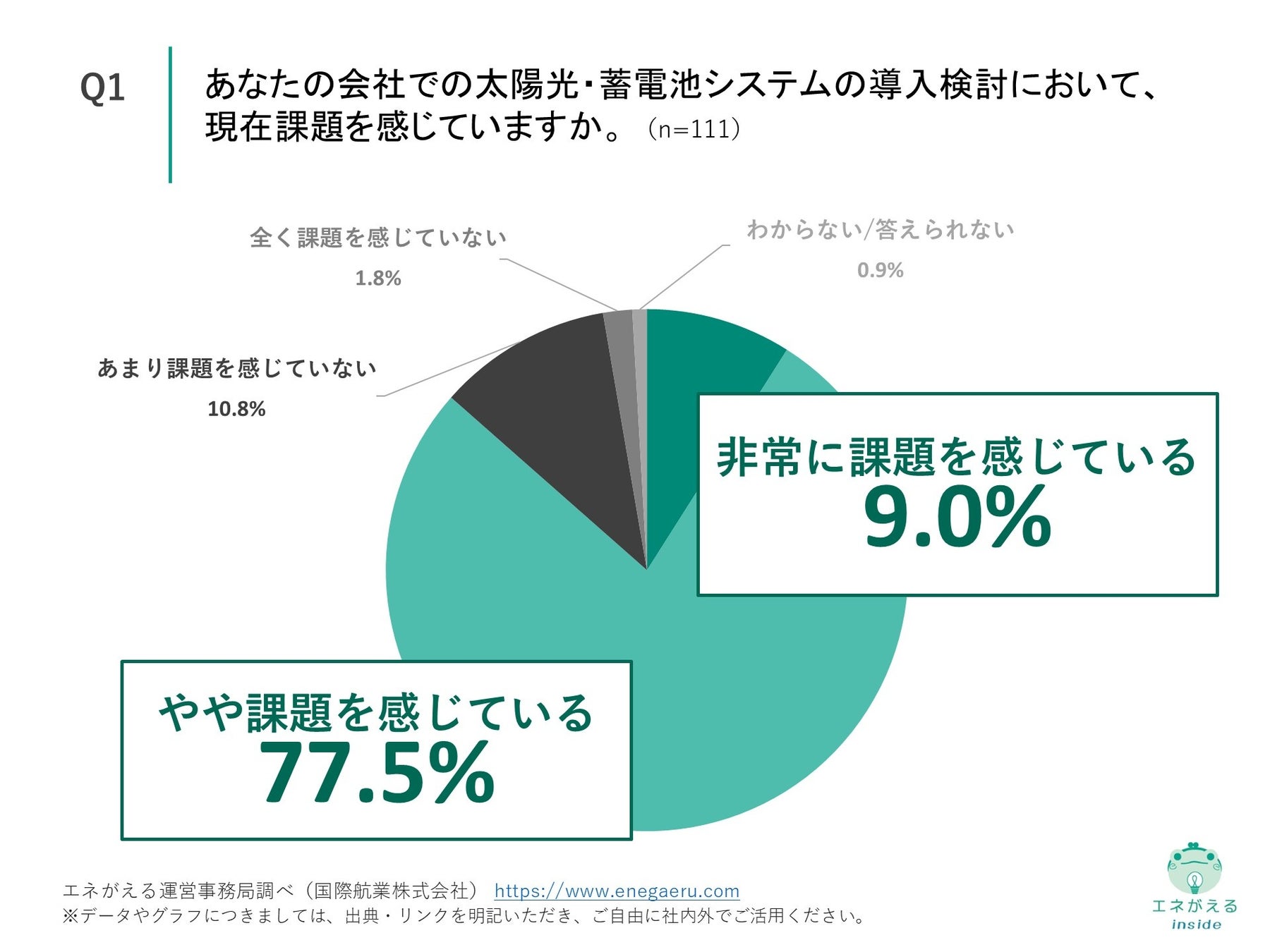 「Q1.あなたの会社での太陽光・蓄電池システムの導入検討において、現在課題を感じていますか。」(n=111)と質問したところ、「非常に課題を感じている」が9.0%、「やや課題を感じている」が77.5%という回答になりました。