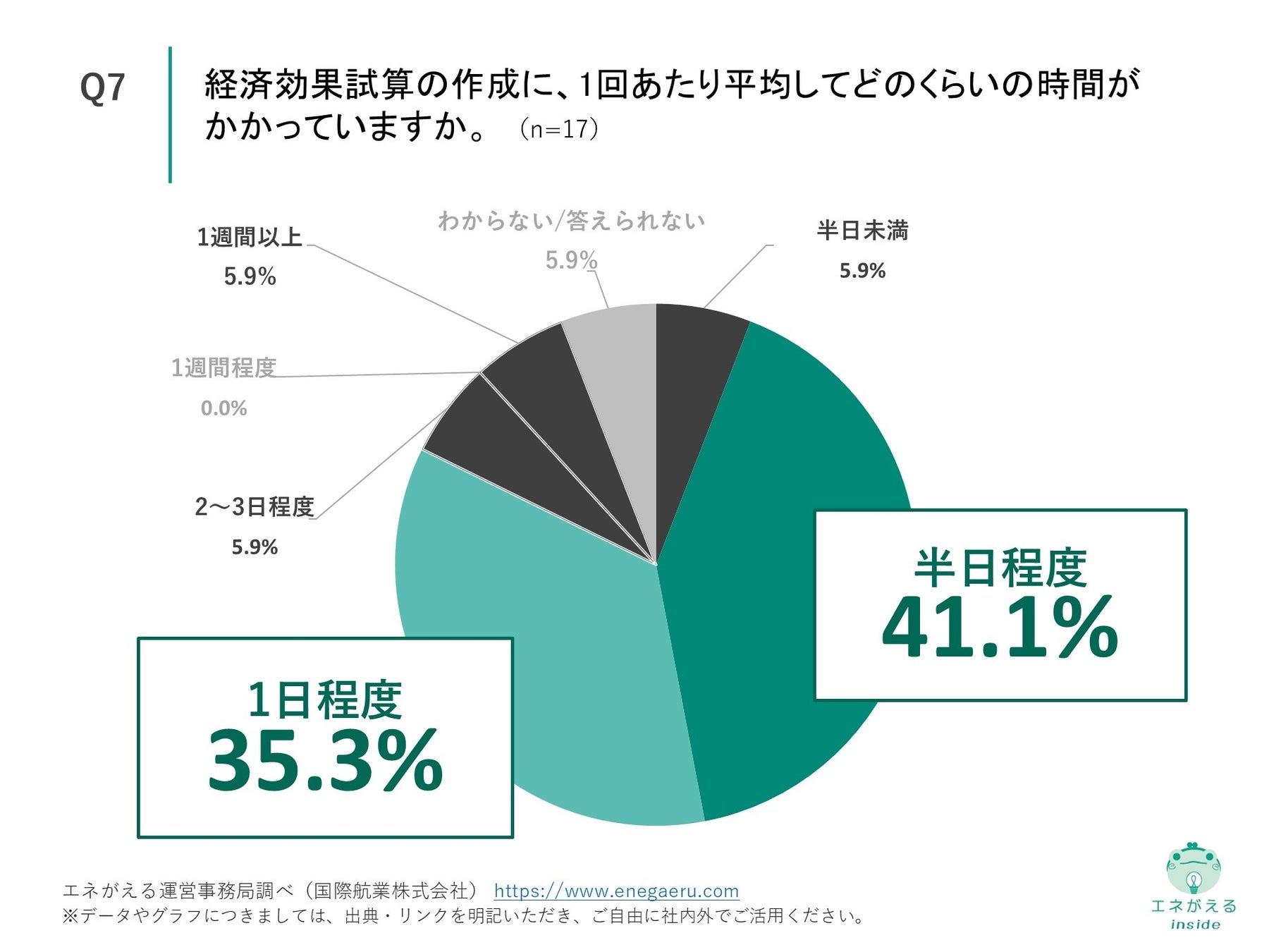 Q6で「既に自社内で対応している」と回答した方に、「Q7.経済効果試算の作成に、1回あたり平均してどのくらいの時間がかかっていますか。」(n=17)と質問したところ、「半日程度」が41.1%、「1日程度」が35.3%という回答になりました。