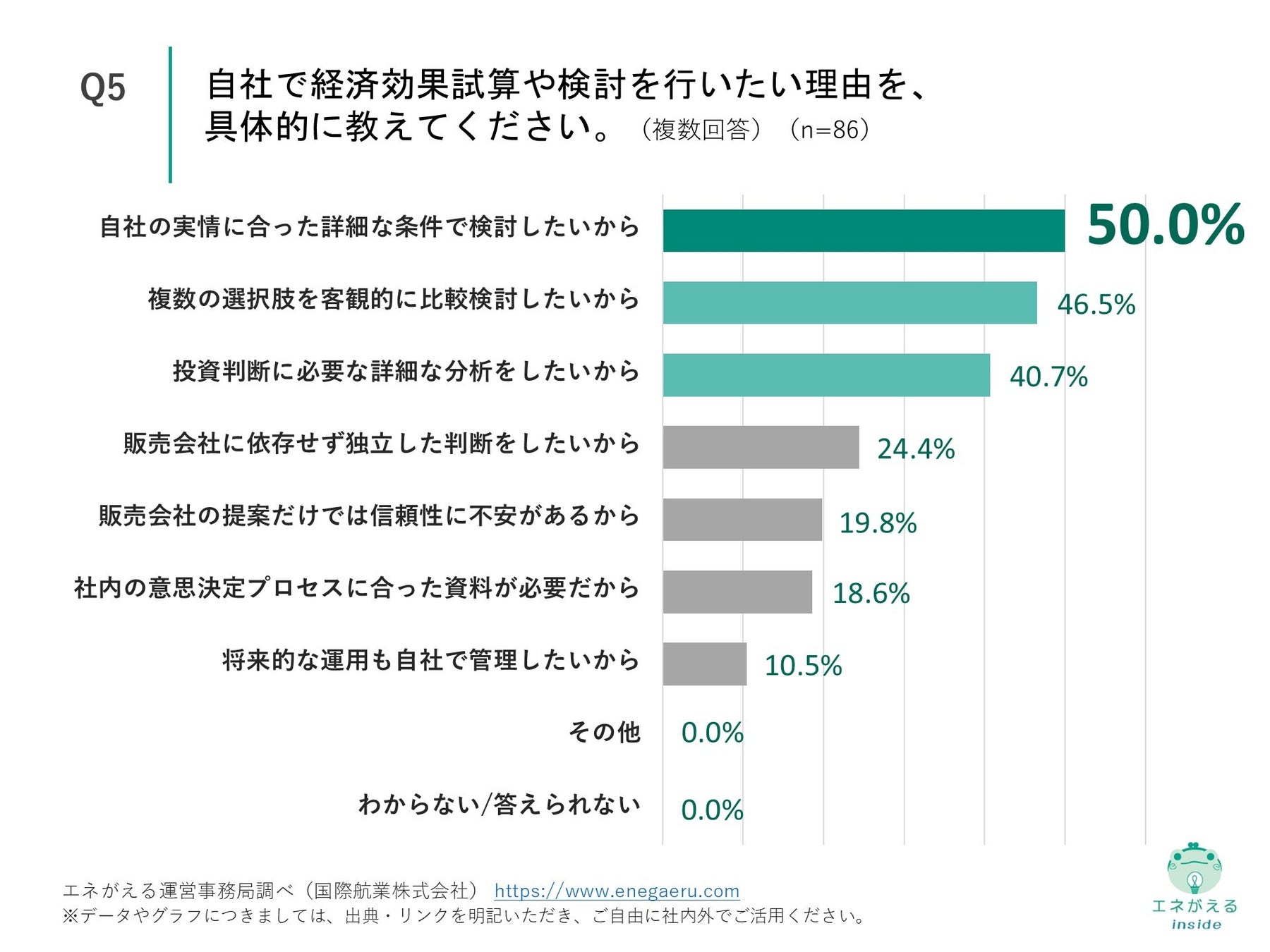 Q4で「自社で主体的に試算・検討を行いたい」「販売会社の提案を参考にしつつ、自社でも検証したい」と回答した方に、「Q5.自社で経済効果試算や検討を行いたい理由を、具体的に教えてください。(複数回答)」(n=86)と質問したところ、「自社の実情に合った詳細な条件で検討したいから」が50.0%、「複数の選択肢を客観的に比較検討したいから」が46.5%、「投資判断に必要な詳細な分析をしたいから」が40.7%という回答になりました。