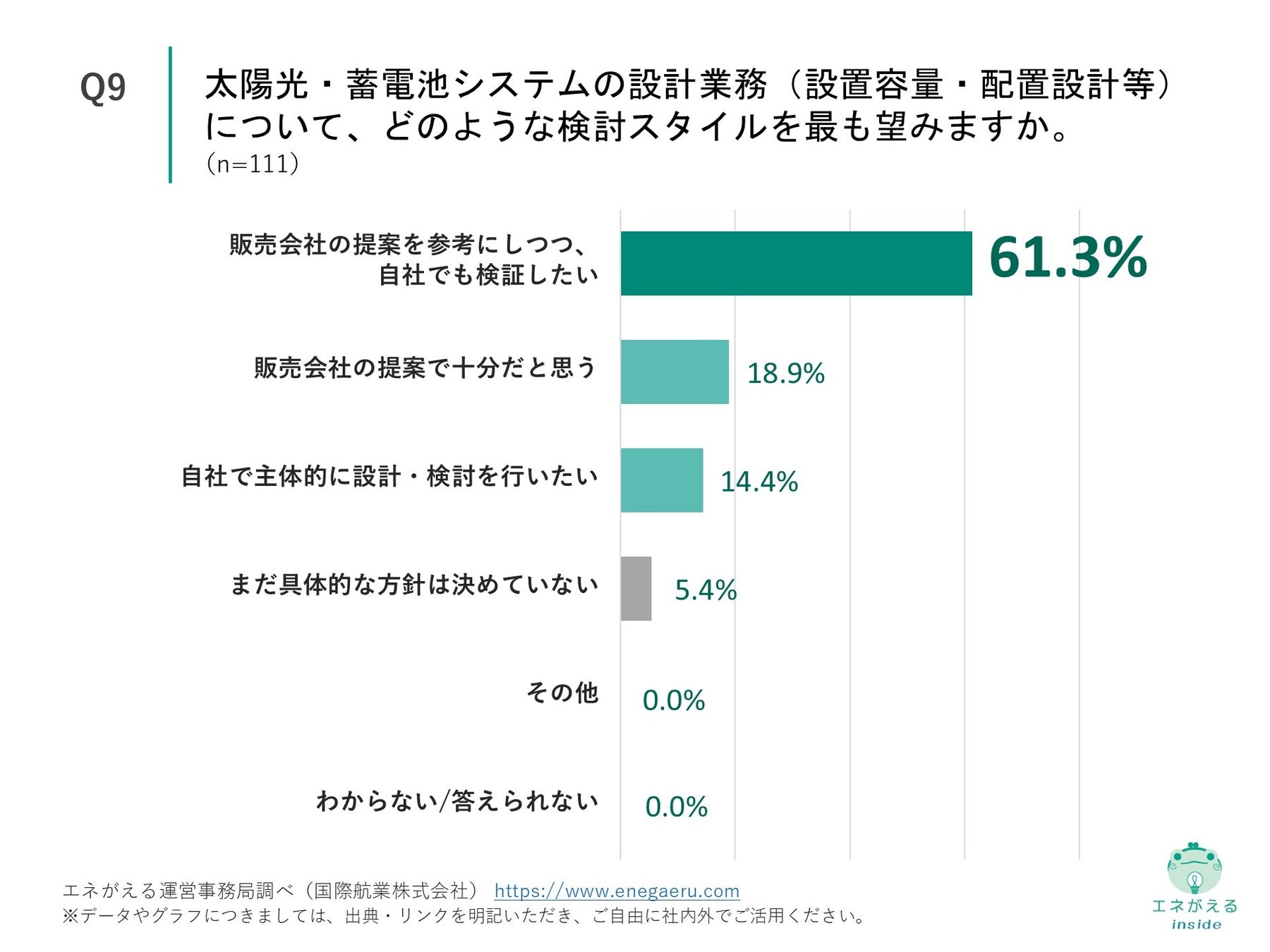 「Q9.太陽光・蓄電池システムの設計業務(設置容量・配置設計等)について、どのような検討スタイルを最も望みますか。」(n=111)と質問したところ、「販売会社の提案を参考にしつつ、自社でも検証したい」が61.3%、「販売会社の提案で十分だと思う」が18.9%という回答になりました。