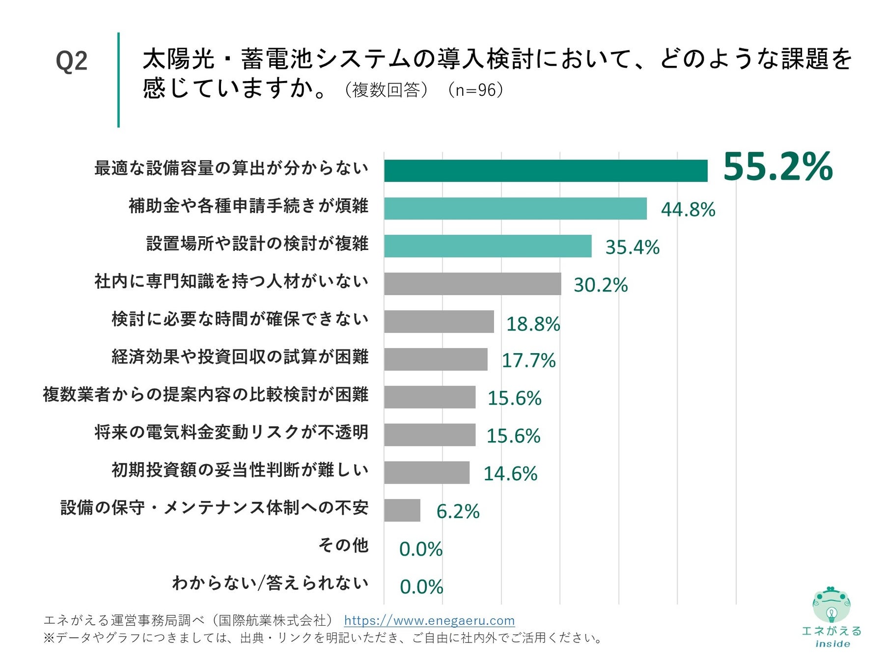 Q1で「非常に多くの課題を感じている」「ある程度課題を感じている」と回答した方に、「Q2.太陽光・蓄電池システムの導入検討において、どのような課題を感じていますか。(複数回答)」(n=96)と質問したところ、「最適な設備容量の算出が分からない」が55.2%、「補助金や各種申請手続きが煩雑」が44.8%、「設置場所や設計の検討が複雑」が35.4%という回答になりました。