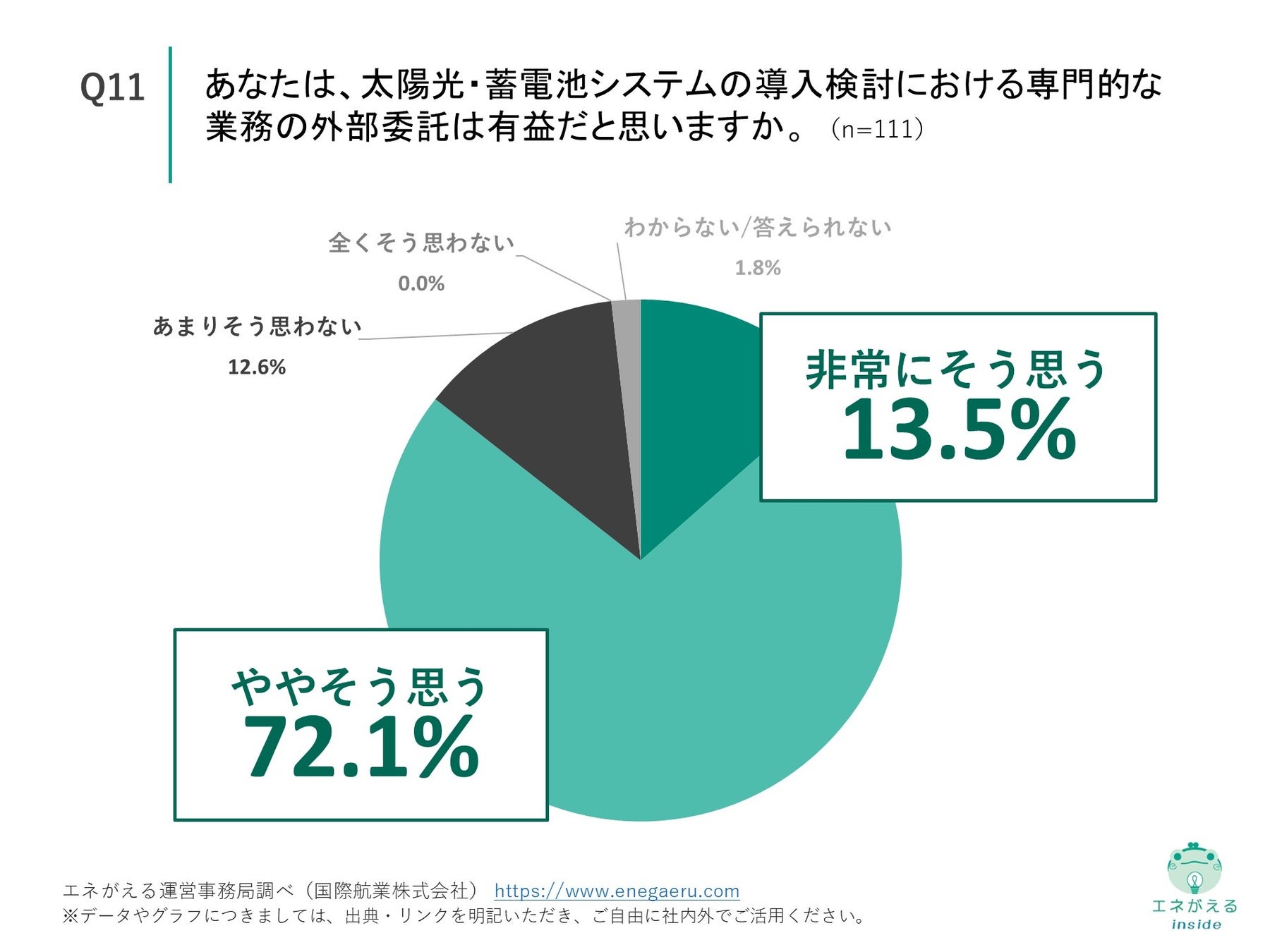 「Q11.あなたは、太陽光・蓄電池システムの導入検討における専門的な業務の外部委託は有益だと思いますか。」(n=111)と質問したところ、「非常にそう思う」が13.5%、「ややそう思う」が72.1%という回答になりました。