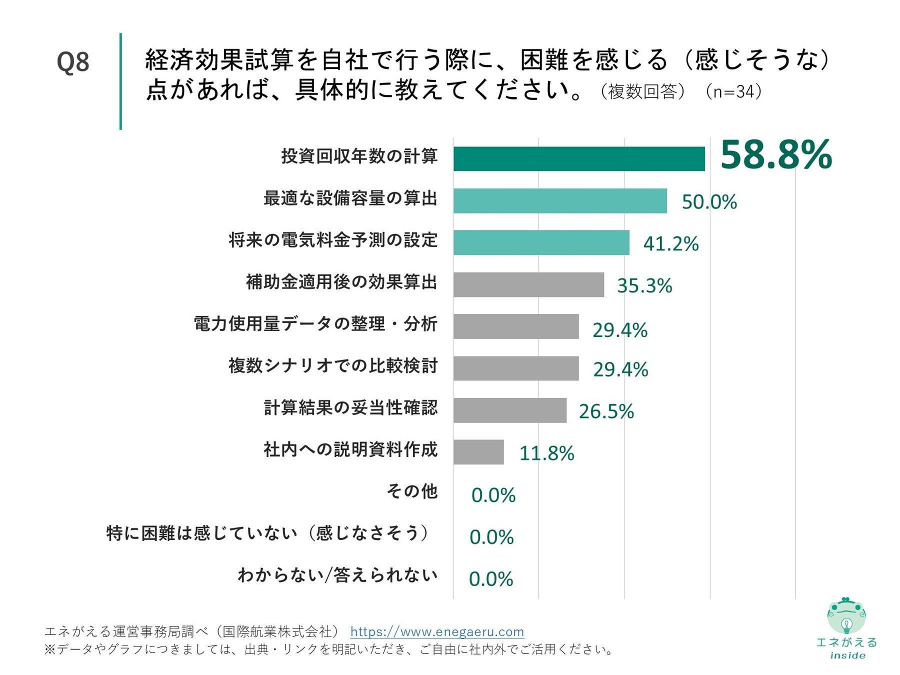 Q6で「既に自社内で対応している」「これから自社で取り組む予定」と回答した方に、「Q8.経済効果試算を自社で行う際に、困難を感じる(感じそうな)点があれば、具体的に教えてください。(複数回答)」(n=34)と質問したところ、「投資回収年数の計算」が58.8%、「最適な設備容量の算出」が50.0%、「将来の電気料金予測の設定」が41.2%という回答になりました。