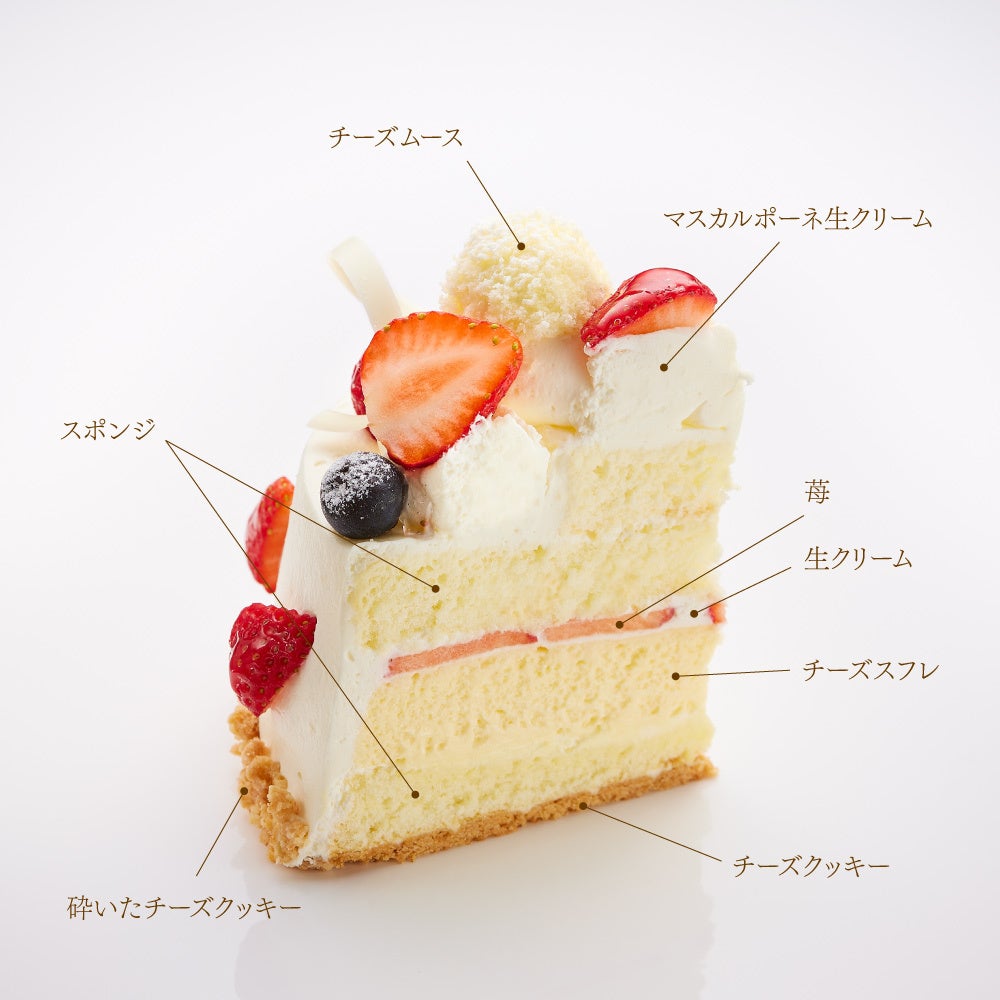 数種類のクリームチーズをブレンドしたなめらかなチーズスフレをスポンジで挟み、間には苺と生クリームをサンド。
