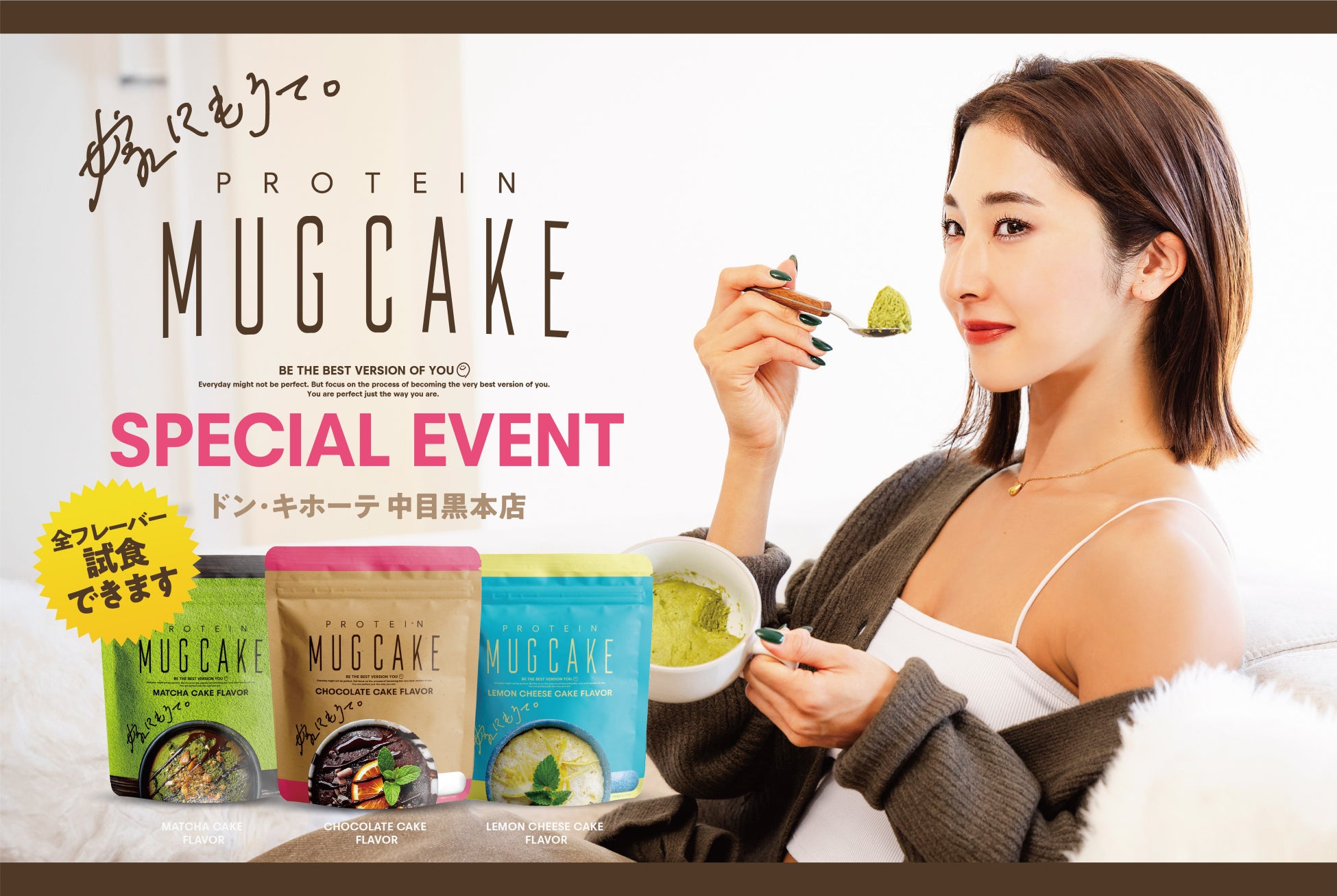「嫁にもろてプロテインマグケーキ」の、「レモンチーズ」「抹茶」「チョコレート」全3フレーバーを試食できる貴重な機会なので、お好みの味を探してみてください!