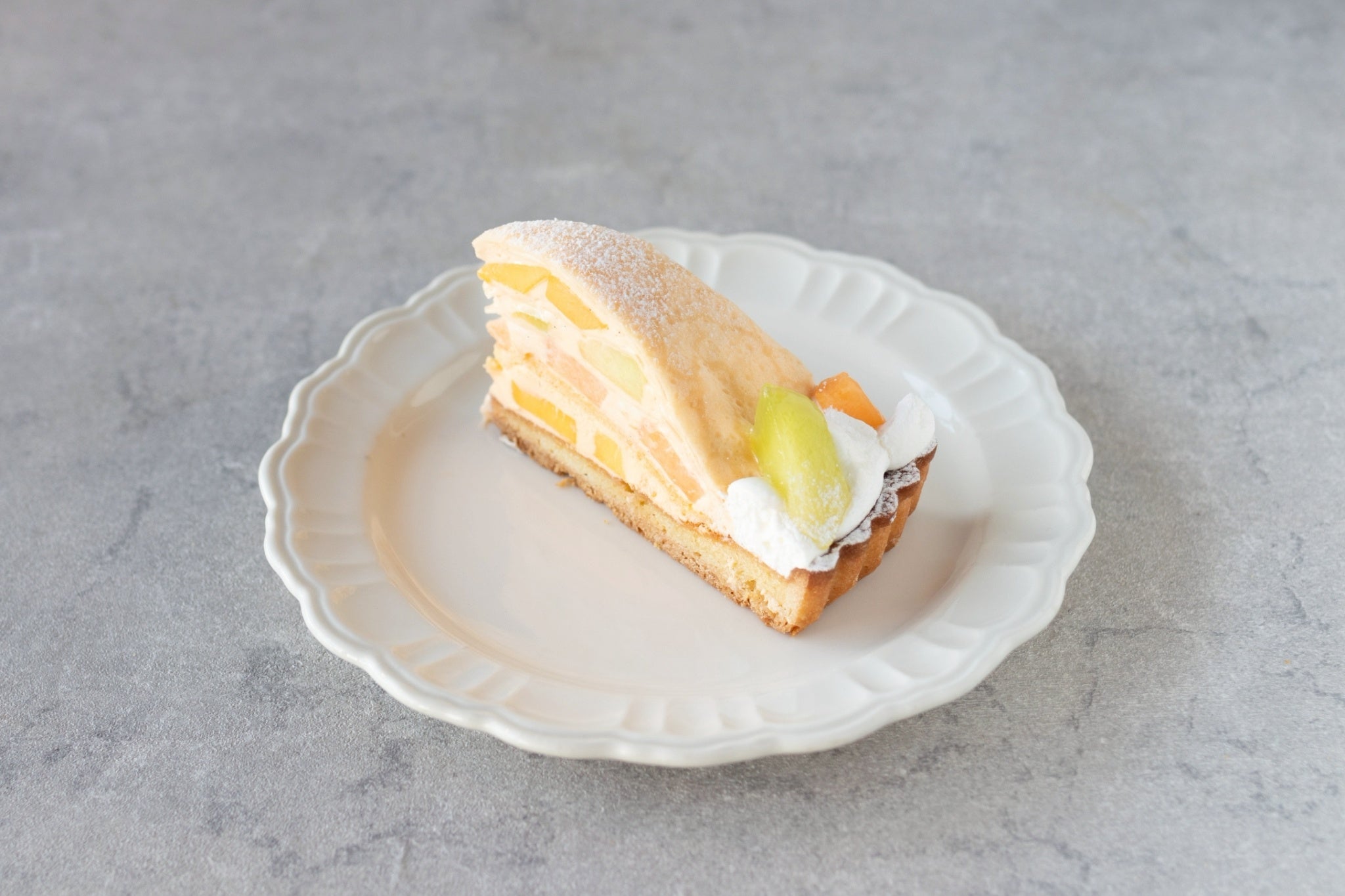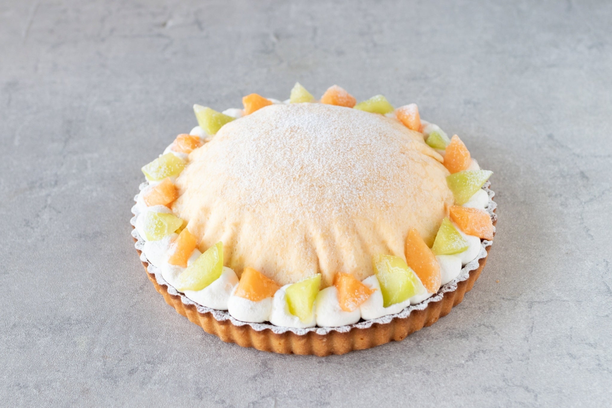 発酵バターを使用したサクサクのタルト台に、旬のメロンとマンゴー、口溶けまろやかな特製クリーム、やさしい甘さのクレープ生地を丁寧に重ねました。