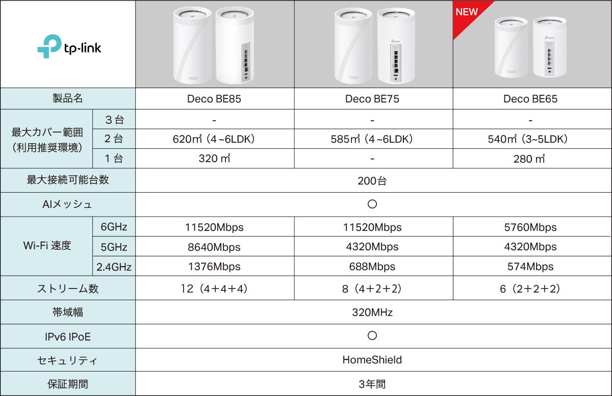 「Deco BE65」製品ページ:https://www.tp-link.com/jp/home-networking/deco/deco-be65/v1%20(1-pack)/
