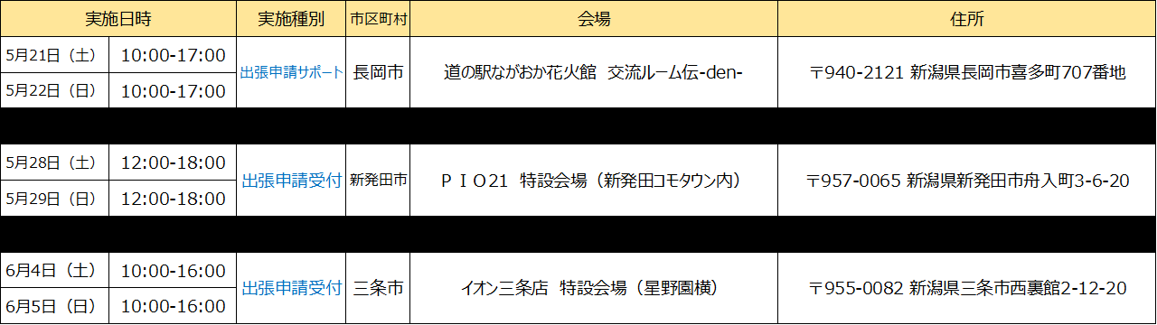 ※開催場所の調整状況や新型コロナウィルスの感染状況等により、「出張申請受付」及び「出張申請サポート」の開催を中止・延期、または実施内容が変更となる可能性がございます。