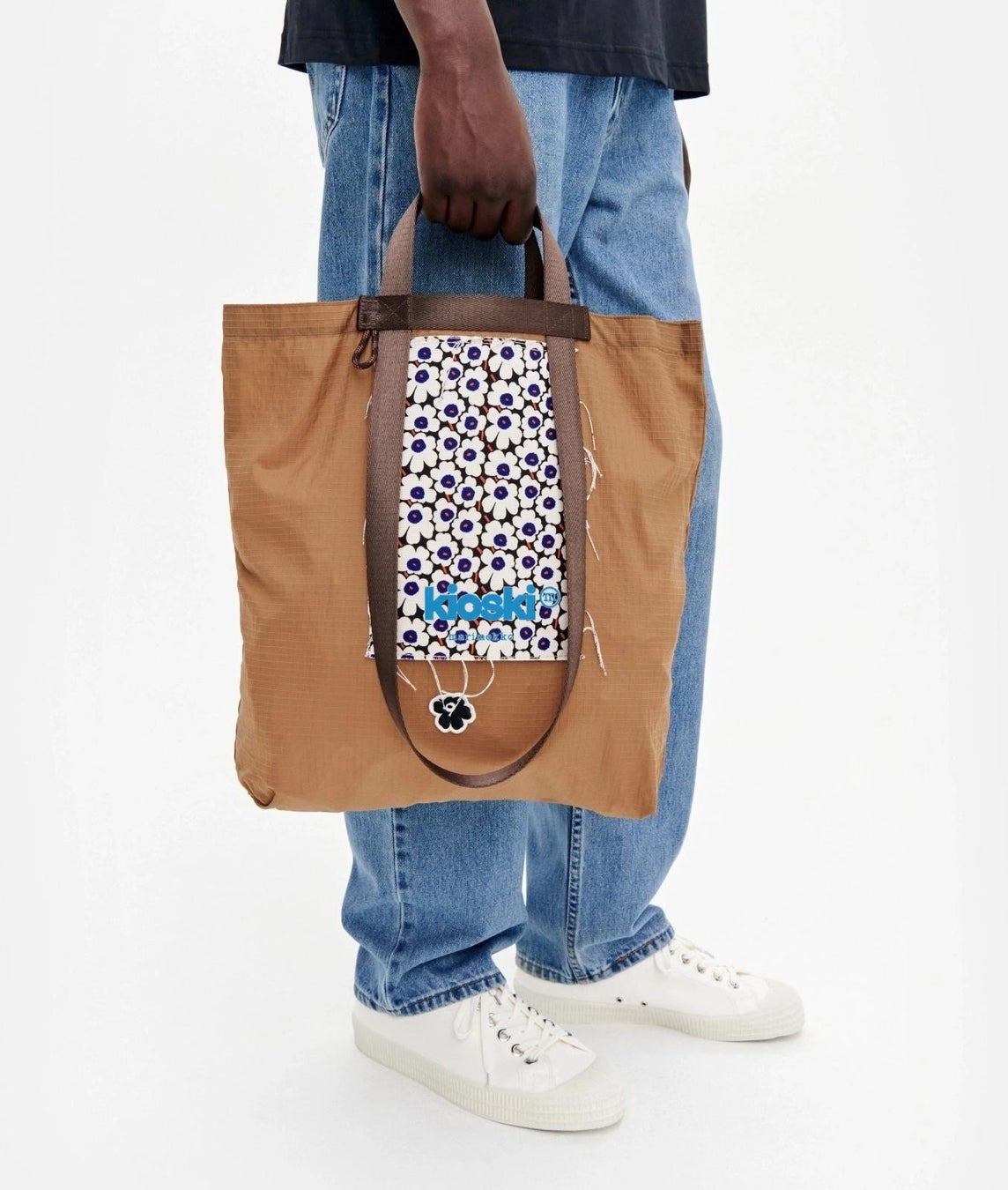 注目すべきは、大胆に縫い付けられた"Kioski Marimekko"のロゴプリント入りのフラップ。ブランドを代表するアイコニックなデザイン、ウニッコ(Unikko/ケシの花)をプリントしたこのフラップは、今回のために生産されたものではなく、全て過去の残ったキャンバス地を使用しています。ミシンで簡単にしつけられた端からは、所々糸がほつれたり、一つ一つ表用が違うのもユニークです。