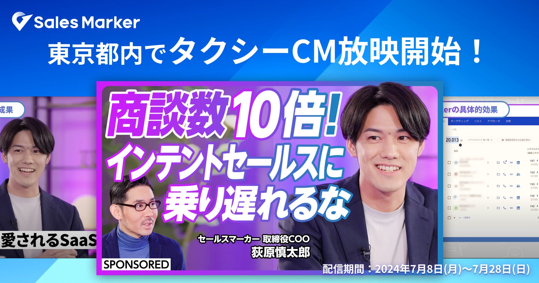 国内初※1「顧客起点」でおこなう新時代の営業手法「インテントセールス」を実現する『Sales Marker(セールスマーカー)』を開発・提供する株式会社Sales Marker(本社:東京都港区、代表取締役 CEO:小笠原 羽恭、以下:当社)は、Sales Marker導入企業をゲストに迎え、インテントセールスを題材に実際の成果についてお話しいただいた映像コンテンツを、7月8日より3週間にわたり東京都内のタクシーCMとして放映開始したことをお知らせします。