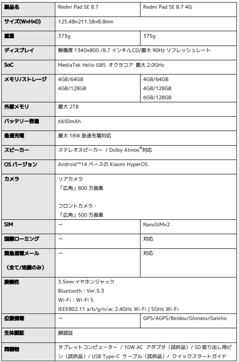 Xiaomi公式サイト(mi.com)https://www.mi.com/jp/product/redmi-pad-se-8-7-inch-4g