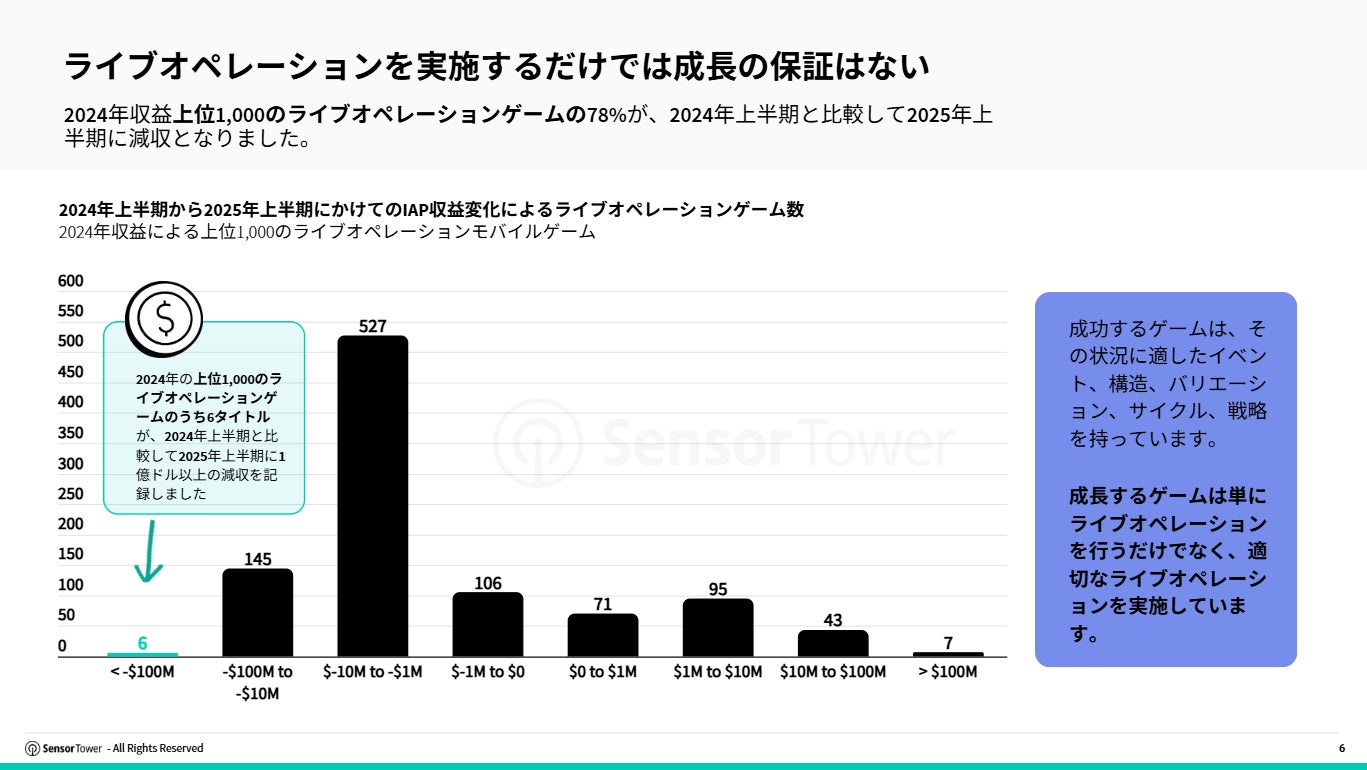 2024年のアプリ内課金(IAP)収益別上位1,000のライブオペレーションゲームの78%で、2025年上半期の収益が前年同期比で減少しています。6タイトルは1億ドル以上の収益減少を記録し、この対象グループの半数以上が100万ドル〜1,000万ドルの収益を失いました。2025年のモバイルゲーム市場は、明らかに容易な市場ではありません。