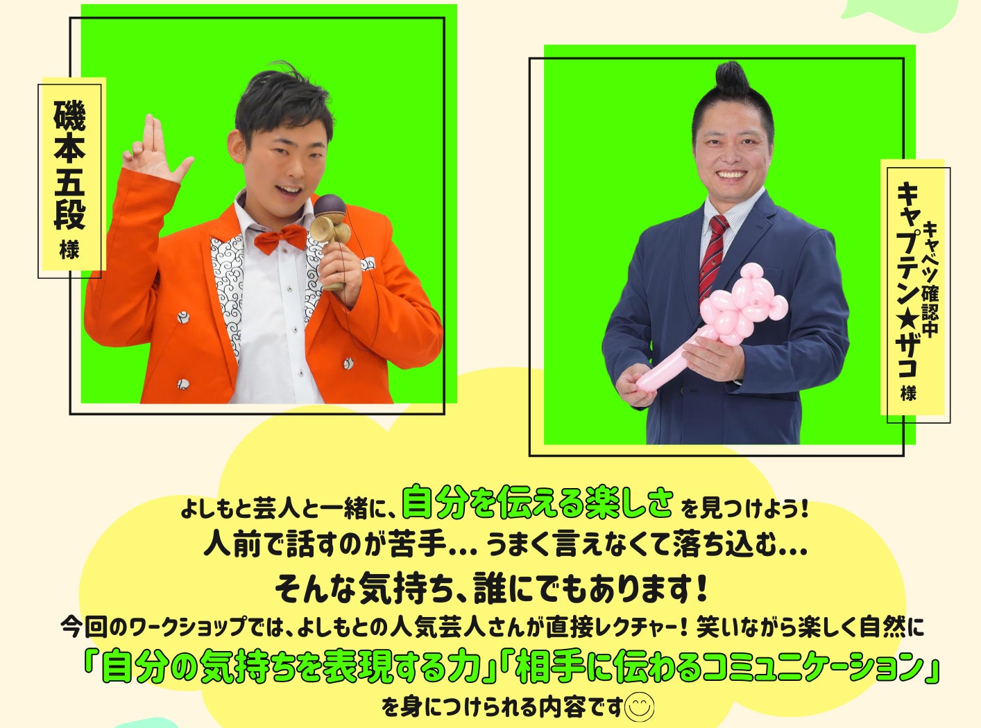 人前で話すことが苦手な人や、自分の気持ちをうまく言葉にできない人でも、よしもと芸人による“笑い”を取り入れた体験型ワークを通じて、楽しく・自然に「自分の気持ちを表現する力」 「相手に伝わるコミュニケーション」を身につけられる内容となっています。