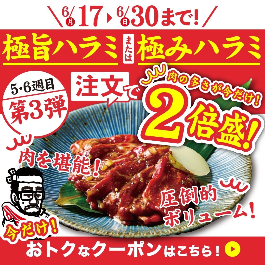 第3弾の6月17日(月)~6月30日(日)は極旨ハラミまたは極みハラミ2倍盛りフェアを実施いたします。