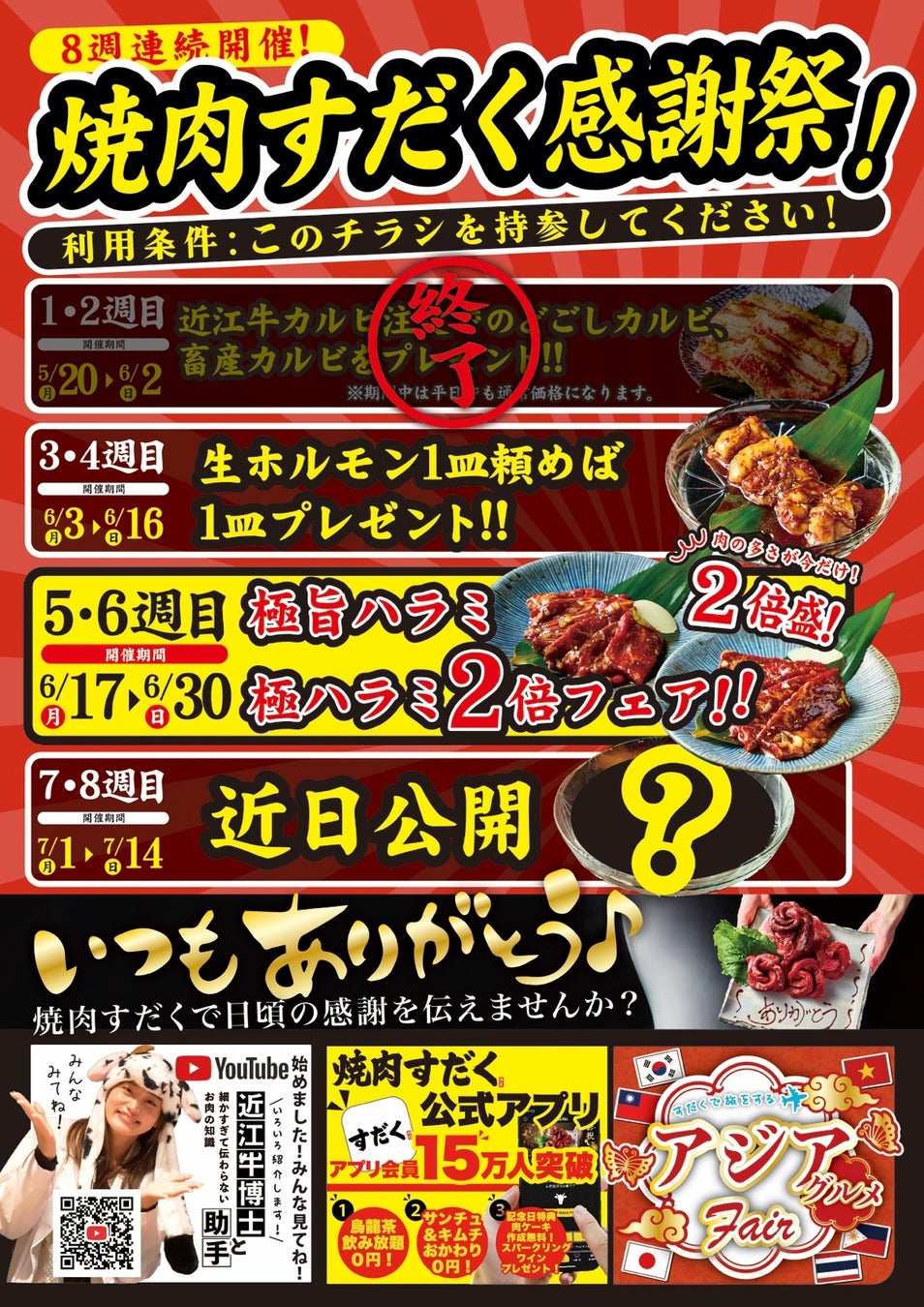 株式会社総合近江牛商社(本社:滋賀県守山市/代表取締役社長:西野 立寛)が運営する【近江焼肉ホルモンすだく】は、2024年5月20日(月)~7月14日(日)の8週にわたり、下記の対象店舗にて「焼肉すだく感謝祭」を開催いたします。