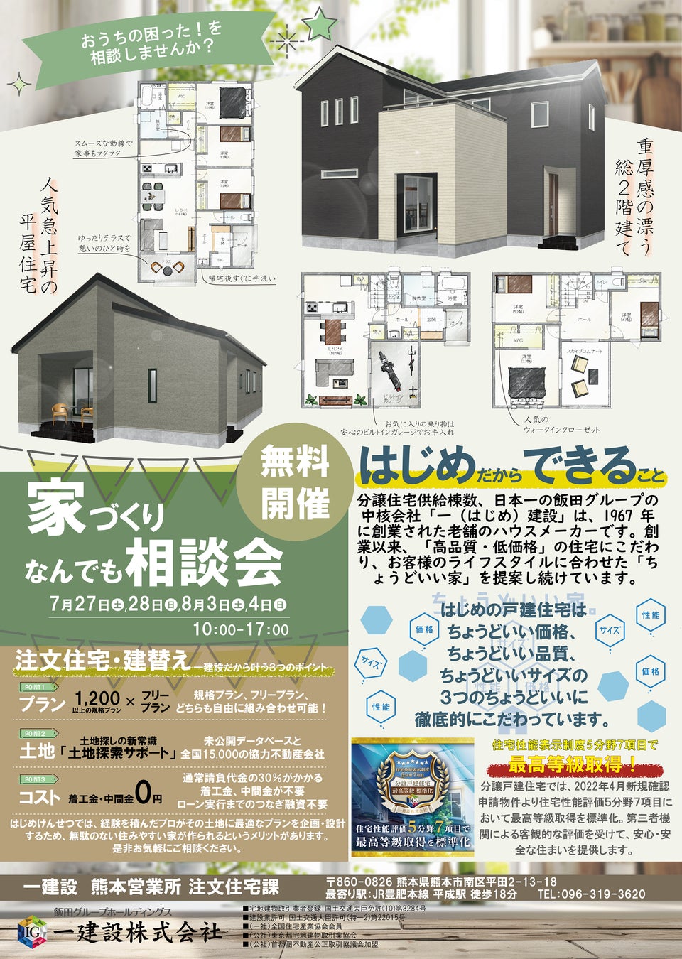 年間46,000戸以上の住宅を供給する飯田グループホールディングスの中核企業の一建設株式会社(本社:東京都豊島区、代表取締役:堀口 忠美、以下、一建設)は、家づくりの疑問や不安を解決する「家づくりなんでも相談会」を2024年7月27日(土)・28日(日)・8月3日(土)・4日(日)の4日間にわたって、一建設熊本営業所にて開催いたします。