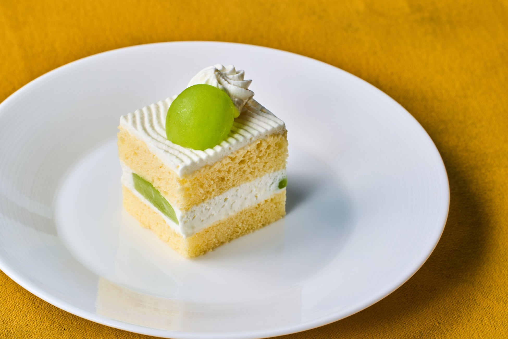 ホテル金沢の定番で、長きに渡って愛されるショートケーキは、ふわふわのスポンジ生地に上品な甘さの生クリームをたっぷり絞り、甘く、ジューシーなシャインマスカットをトッピング。