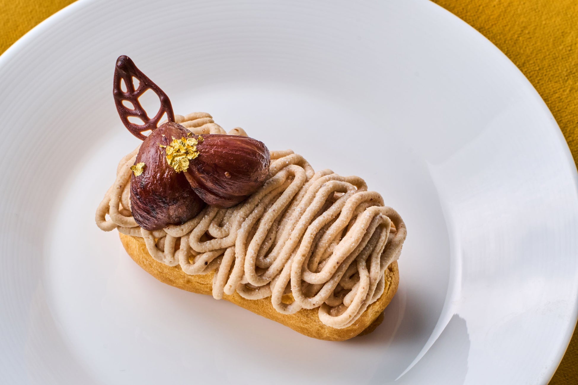 香ばしいロングシュー生地の中には、カスタードクリームと濃厚なマロンクリームがたっぷり。トップに細かくマロンクリームを絞りだし、まるでモンブランのような可愛らしい仕上がりに。