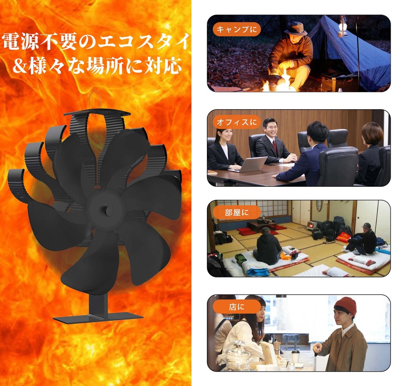 【石油ストーブ対応&様々な場所に対応】普段使われている薪ストーブや対流式ストーブの上に乗せて、熱発電の力を利用してファンが回り始めます。冬キャンプでよく耳にする悩みの一つが「足元の冷え」です。外で過ごす時はこのストーブファンが防寒対策としては最適です。