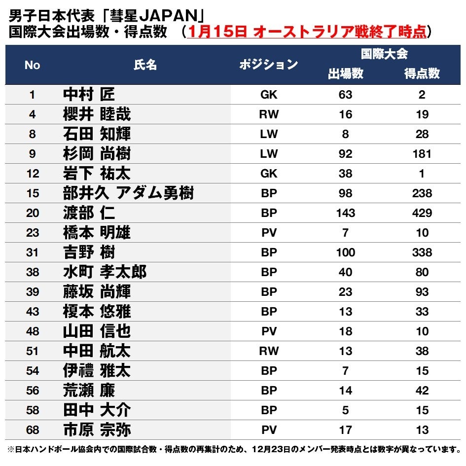 1月15日、クウェートで開催中の第22回男子ハンドボールアジア選手権において、男子日本代表「彗星JAPAN」の吉野 樹選手が、予選ラウンド第1戦・オーストラリア戦にて日本代表としての国際大会出場通算100試合を達成しました。